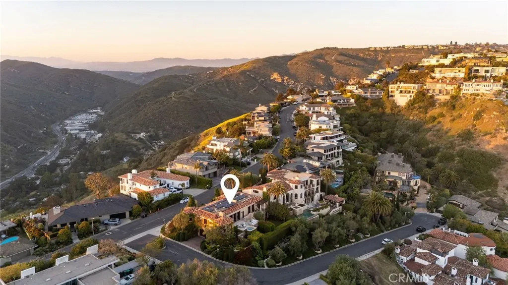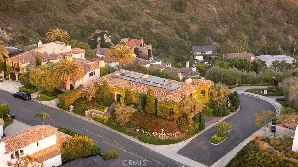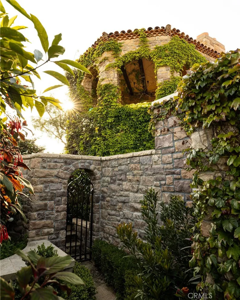 Winding pathways lead through fragrant rose gardens, tranquil fountains, and manicured lawns, culminating in an upper-level terrace with a spa and a circular dining tower that captures the sea breeze year-round. Offering plenty of space to entertain, the backyard hosts multiple seating areas designed for large scale gatherings. A finished 3-car garage, solar, and home automation complete the residence.