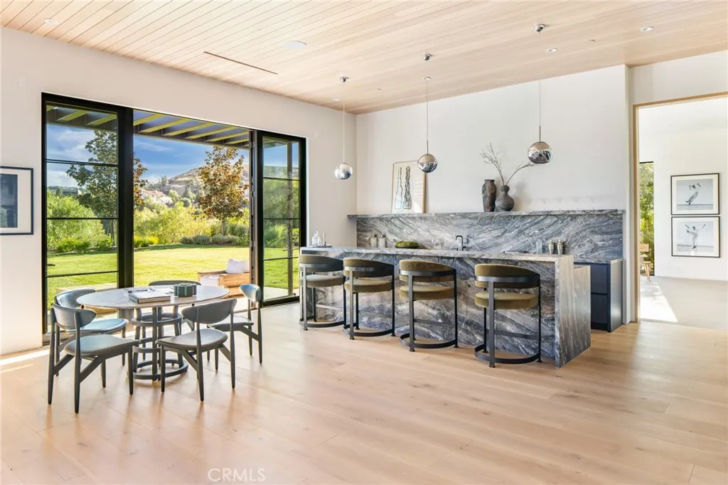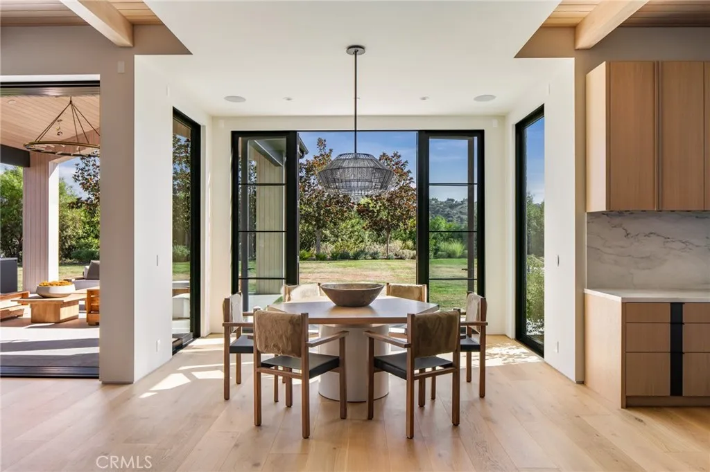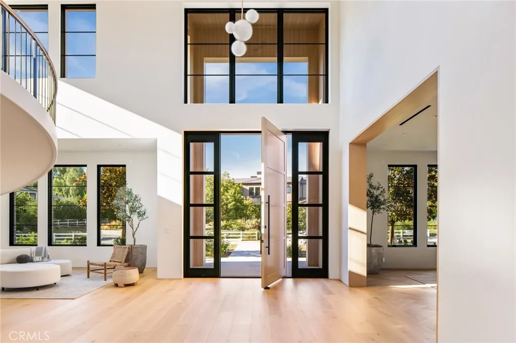 This absolutely gorgeous, new custom estate features beautiful pastoral views, is nestled on a lushly landscaped two acre lot, and is sited at the very end of a scenic cul de sac. The superb open floor plan is flooded with natural light and is highlighted by excellent quality finishes throughout. Amenities include a stellar chef’s kitchen (plus a prep kitchen) with four ovens and two islands, one with counter seating, adjoining the sunny breakfast room, all opening to the spacious family room with large stone fireplace and siding walls of glass leading to a large, covered outdoor patio with skylights and full barbecue center. Additional amenities include a gracious formal dining room with glass encased, refrigerated wine wall, beautiful custom office with huge picture windows, a stunning home theater with acoustic paneled sound walls & back-lit coffered ceiling, adjoining entertainers lounge/game room with wet bar, large gym with a motorized opening wall, massage area, and a full bath that includes a steam shower & sauna, plus there is an upstairs bonus room/loft. There are seven generous en suite bedrooms in the main house, four upstairs and two on the main floor. The superb primary suite offers a vaulted, open beam ceiling, full wall windows, white oak floors, a stone fireplace, deluxe dual baths with a shared, oversize walk-in shower, a big soaking tub, room sized, glass fronted custom closets and a big sitting balcony capturing the sunset views. The nicely private grounds include a full guest house, a big sparkling zero edge pool with oversized Baja shelf, a large spa, covered patio, mature trees, and a big private yard with lot’s of grass & play areas, plus garages for 7-cars finished with gleaming epoxy floors, plus there is additional off street covered parking. This luxurious home exemplifies the essence of the relaxed, indoor/outdoor California lifestyle.