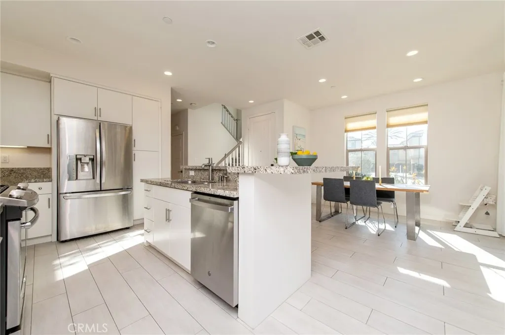 The main level features an open-concept layout with neutral tile flooring throughout the primary living areas. The kitchen includes granite countertops, a center island with seating, stainless steel appliances, and ample cabinetry, and opens seamlessly to the living and dining areas—ideal for everyday living and entertaining. Sliding doors extend the living space outdoors to a private patio area designed for indoor-outdoor enjoyment, featuring a covered outdoor section, hardscape surfaces, and low-maintenance landscaping.