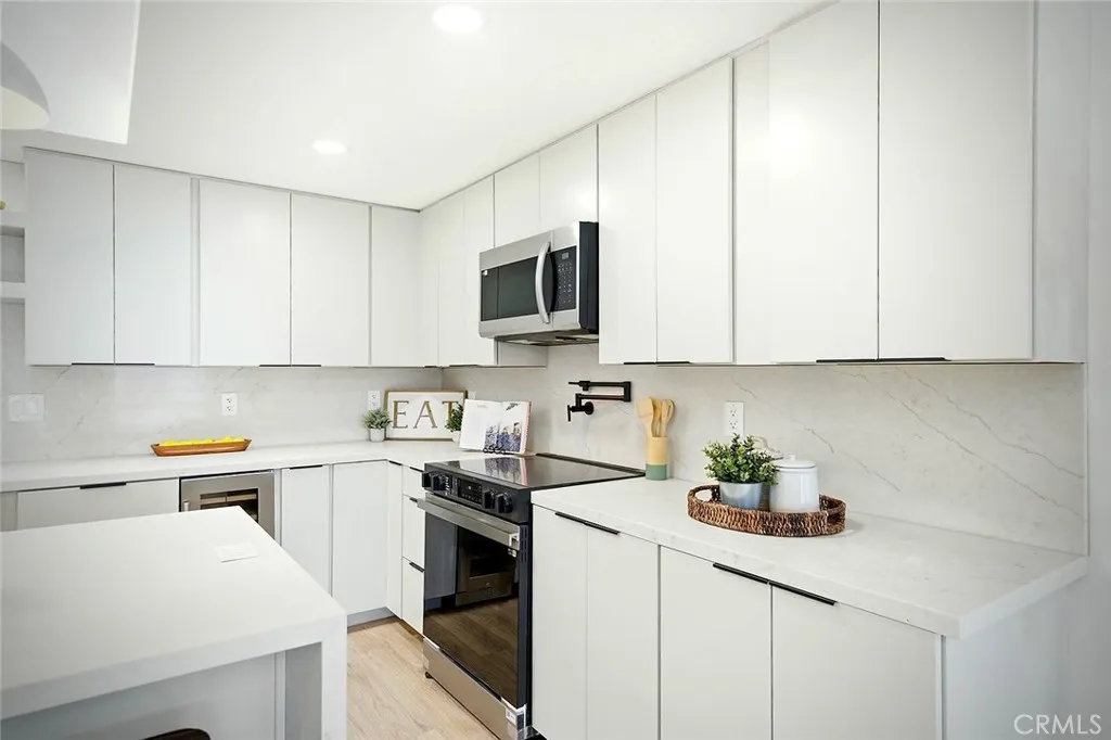 Designer finishes are found throughout, including porcelain tile, curated paint colors, luxury vinyl plank flooring, custom baseboards, solid-core doors with new hardware, and all-new matching appliances—including a wine refrigerator. Additional upgrades include central air and heat, dual-pane windows, and a custom living-room accent wall with a built-in electric fireplace and TV niche.