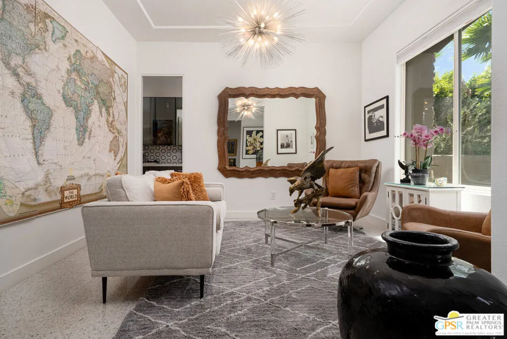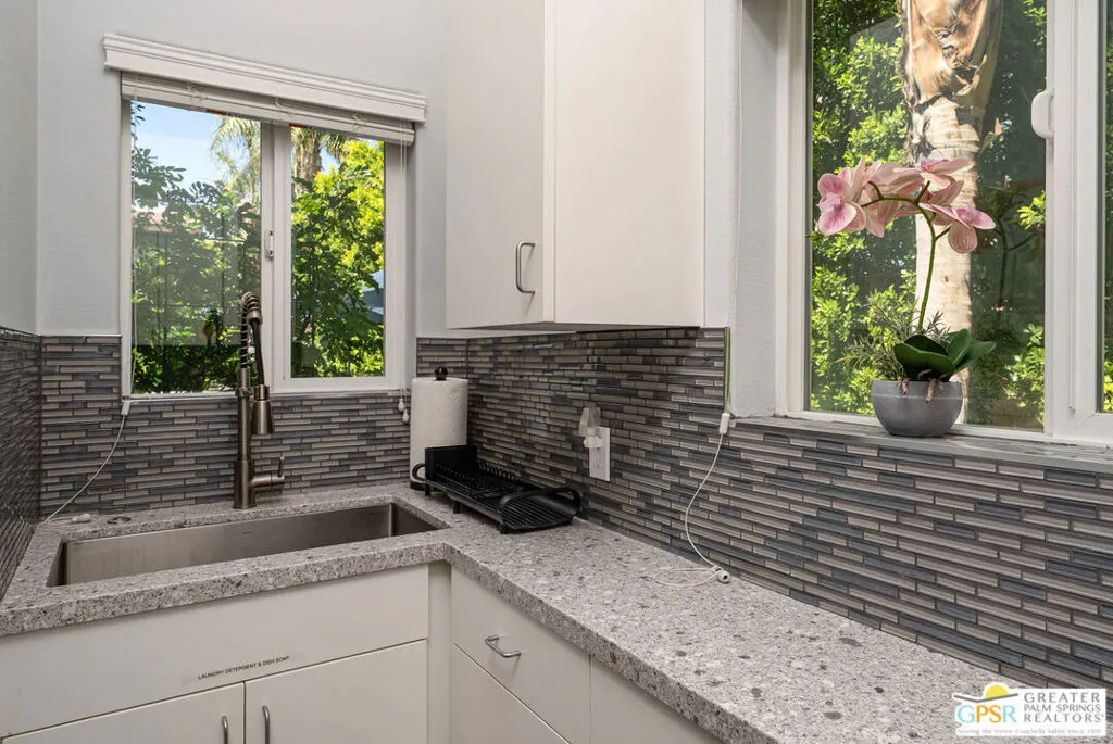 Enormous beautifully renovated 3 bedroom home with separate 1 bed/1 bath GUEST HOUSE in Palm Springs. The Guest House features a separate private walkway, gate and entrance as well as a full kitchen and washer/dryer. Built in 2004, this home has been lovingly maintained and upgraded. The large terrazzo tile flooring extends throughout the entire home. The spacious open floor plan brings the kitchen, living room and dining room together for inclusion for all. This home is spacious and boasts an open kitchen that flows into the great room, which is anchored by a fireplace and tempting views of the private pool/spa area. The large gourmet cook’s kitchen includes an large central island with counter seating, Butler’s pantry/coffee station, dry goods pantry, Bosch appliances, gas cooktop and modern tile backsplash. The primary suite is EXPANSIVE with a full office/private living room/media room attached at the back. With a small change, this room could even be a 5th bedroom or 2nd casita as it has it’s own private entrance. The primary bath includes a stand alone tub, large shower, dual sink floating vanity, appropriately sized expansive mirror, separate water closet and walk-in closet with custom shelving. Two guest suites share the guest bath also with stunning dual sink vanity and matching impressive custom mirror. Views of the pool and spa can be seen from almost every room through dual pane windows and sliding doors. Energy efficiency was well considered with multiple AC zones, enhanced ceiling fans and 42 solar panels. Parking includes an oversized 2-car garage and a driveway with room for 3 cars. Other amenities include water conditioner system, outdoor shower, tankless water heater and a separate laundry room with upper and lower cabinets, sink, counter space and window with a mountain view. THE CASITA has a separate PRIVATE walkway and entrance. Inside, a bedroom, living room, stackable laundry, desk/dining table, kitchen with cabinets, counters, refrigerator, sink and disposal, gas range, oven and microwave. The owners have rented this casita out casually making about $20,000 per year income. Alternatively, live and use the casita while renting out the main house for even greater income. In the back yard, the pool and spa with waterfall takes the main focus. Don’t miss the hardline gas grill, outdoor shower, pet friendly grass areas and entertainment area for outdoor table tennis and games. The versatility of the homes features will make you feel at home immediately upon arrival. On land that you own. No HOA. Solar system includes 42 panels w 13.73kW.