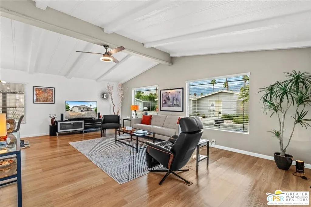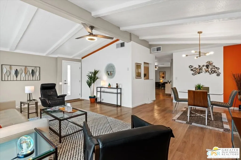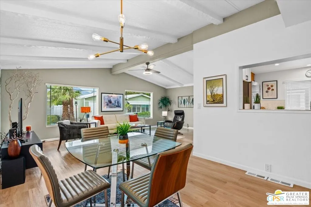 Welcome to 152 Hilligoss a beautifully upgraded 2 bedroom, 2 bathroom home located in the desirable gated community of The Canyons in Cathedral City. Situated on a premium corner lot with breathtaking mountain views, this 1,440 sq ft residence offers exceptional value with extensive modern improvements throughout. The bright and open living room features soaring high ceilings, dual pane windows for energy efficiency, and a modern lighted ceiling fan. This flows seamlessly into a spacious dining room ideal for hosting gatherings or enjoying everyday meals. The fully upgraded kitchen is a standout, showcasing soft-close cabinetry, a stylish metal farmhouse sink, newer appliances, recessed lighting, under-cabinet lighting, a separate island, and generous counter and storage space, creating both beauty and functionality. Just off the kitchen is a comfortable family room with direct access to the large covered patio, perfect for seamless indoor-outdoor living and entertaining. There is a generous primary bedroom suite with a bathroom that has been tastefully remodeled with quality finishes, offering dual sinks and a modern step-in shower. The second bedroom has direct access to the second upgraded bath with a shower and tub combo. Additional major upgrades include exterior paint completed in 2024, brand new front and back exterior doors, gas hookups available for both stove and dryer (currently electric), a newer storage shed at the end of the carport, and a separate laundry room with newer washer and dryer plus extra storage. The outdoor space has been thoughtfully designed with a concrete slab covered patio ideal for relaxing or entertaining, along with pavers along the back for easy access and low maintenance. Residents of The Canyons enjoy a gated, centrally located community offering a sparkling pool and spa, clubhouse with fitness area, billiards, card room, library, an activities room and lots of walkable green spaces, providing a resort-style lifestyle close to everything the Coachella Valley has to offer. With its premium lot, extensive upgrades, remodeled bathrooms and kitchen, energy-efficient windows, and fantastic community amenities, this move-in ready home offers outstanding value and is a must-see!