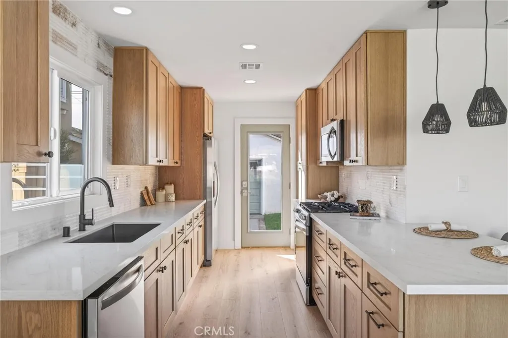 Fully remodeled with warm, modern style, 21405 Mildred Ave offers turnkey living in the heart of Torrance’s desirable Southwood neighborhood on one of the most coveted streets. This 3-bedroom, 2-bathroom home has been thoughtfully updated from top to bottom, blending charm, comfort, and functionality in one inviting package. At the center of the home, a beautifully redesigned kitchen features white oak shaker cabinets, quartz countertops, tile backsplash, and stainless steel appliances—all chosen for both style and durability. Both bathrooms have been fully remodeled with double vanities and tasteful finishes, including new tile work, updated fixtures, and a glass-enclosed shower in the ensuite. The laundry area is conveniently located near the bedrooms, and a sliding glass door from the rear bedroom leads out to a brand-new wooden deck and oversized backyard—freshly landscaped to provide a sunny play space with the perfect trees offering afternoon shade. Natural light fills the interior, highlighting the soft neutral tones, recessed lighting, and brand-new laminate flooring that flow throughout. Fresh exterior paint and clean curb appeal round out the home’s welcoming first impression. Additional upgrades include: new HVAC and ducting, upgraded 200-amp electrical panel, new wiring, updated plumbing, new windows and exterior doors, interior doors and hardware, modern light fixtures and ceiling fans, finished garage, and a new automatic sprinkler system. All of this just minutes from award-winning Torrance schools, local parks, shopping, dining, and the beach—this is South Bay living at its best, combining everyday ease with a move-in ready finish.