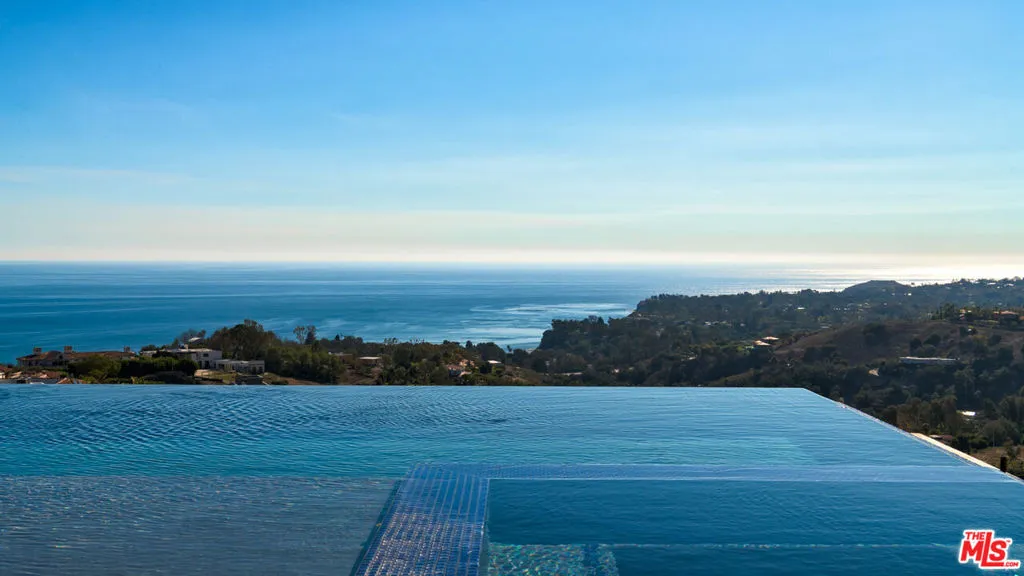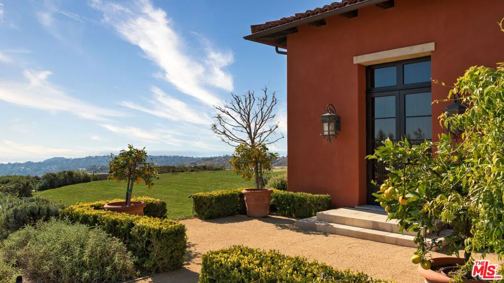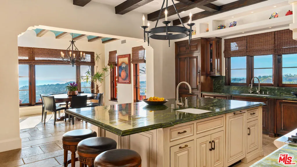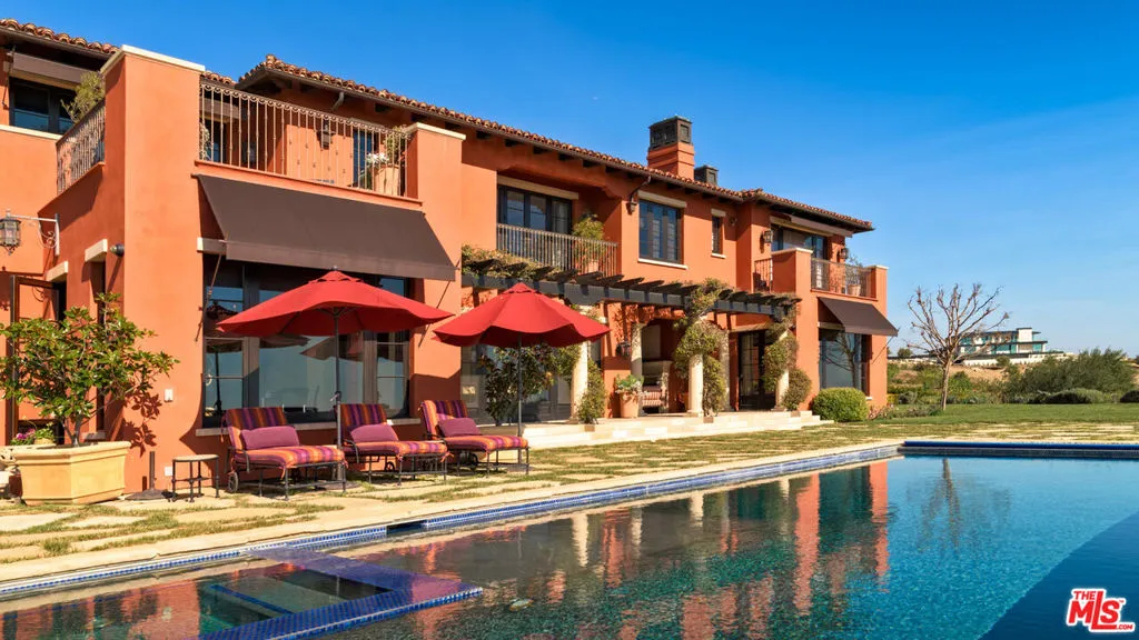 Enter through a grand metal, glass, and wood front door framed by a stone doorway, where breathtaking ocean views immediately greet you. The foyer boasts soaring wood-beamed ceilings and a chandelier, setting the tone for refined elegance. To the right, the formal dining room features high wood-beamed ceilings, arched entryways, and a butler’s pantry. Steps lead down to the Main Gallery, lined with barrel ceiling arches and light fixtures. The chef’s kitchen is designed for both beauty and functionality, featuring an oversized island with bar seating, stone counters, and wood-beamed ceilings. Premium Wolf appliances, including a double oven stove, additional wall oven, six-burner range, pot filler, and hood fan, complete the space. A Subzero fridge, freezer, and refrigeration drawers provide ample storage. Adjacent, an ocean-view breakfast nook offers stunning pool and coastline vistas. The Family Room includes two sets of French doors opening to the backyard and also features a sliding folding wall system/accordion doors leading to the loggia. An outdoor fireplace and heaters extend the living space year-round. A second living area, accessed through a stone-lined hallway, showcases French limestone floors, an Antilles fireplace, and panoramic ocean views. Behind it, a wet bar with Italian marble countertops with a leather finish, built-ins, and a mini fridge enhances the space.Upstairs, ocean-view bedrooms feature wood floors, large closets, and en-suite baths with stone counters and showers. A guest suite boasts a balcony, high ceilings, and pink marble counters with a shower-over-tub design. The primary suite is an exquisite retreat with a fireplace, a wet bar with a mini fridge, and two expansive closets. The second primary bath features a freestanding jetted tub, a double sink vanity, a shower stall with ocean views, and a private water closet. A stately library off the Main Gallery includes custom built-ins, a cupola, a rolling ladder, and French doors opening to the backyard. An elevator provides convenient access to all three floors. The entertainment level features French limestone floors, a bar with a marble countertop, stone counters, a sink, and a mini fridge. A full gym and a movie theater, which seats 20 comfortably, complete the space.The backyard is a breathtaking sanctuary, with a formal rose garden, an infinity pool with panoramic ocean views, and an outdoor kitchen with a BBQ and bar seating. A built-in couch surrounds a fire pit. Steps lead to a grassy area and an orchard filled with fruit trees. The front yard boasts a lavender garden, privacy hedges, and an expansive carport, while the garage features two 220-volt chargers, alongside space for over 20 vehicles and a Tesla Powerwall. Additional features include a security system, Tesla power walls, prewired generator capability, electrical closets in the backyard, a doggy door, and a double-enclosed dog run. Crestron automation enhances the home’s theater, ensuring a seamless modern experience. Designed by renowned architect Richard Landry, this estate defines coastal luxury, offering an unparalleled blend of sophistication, comfort, and breathtaking natural beauty.