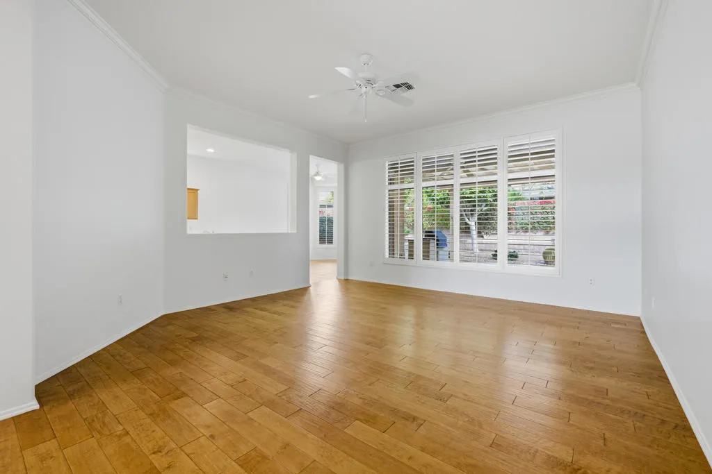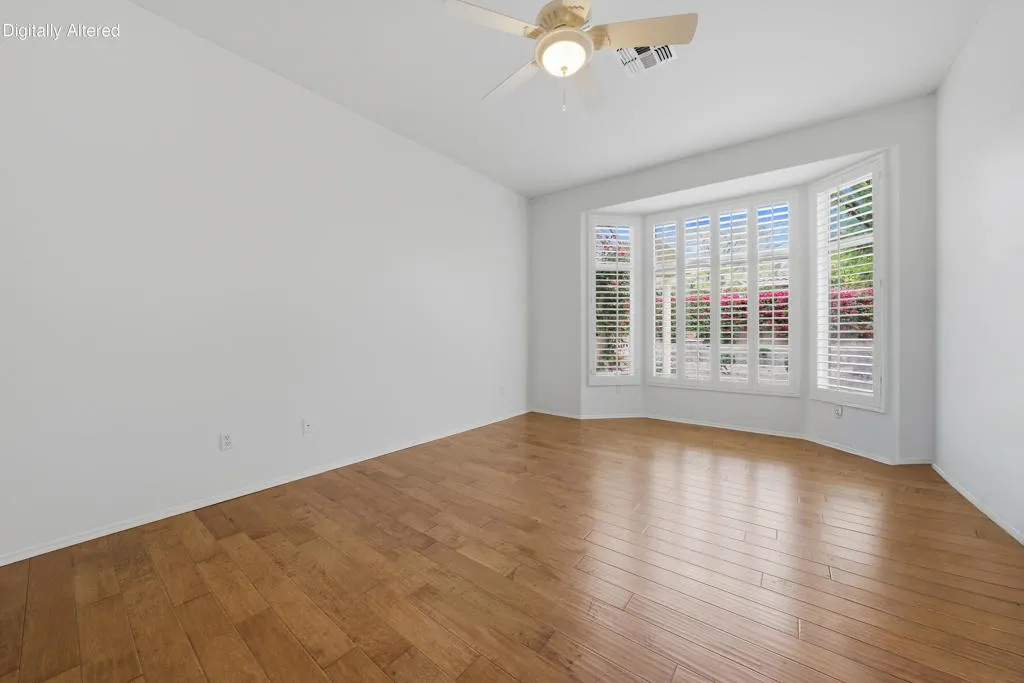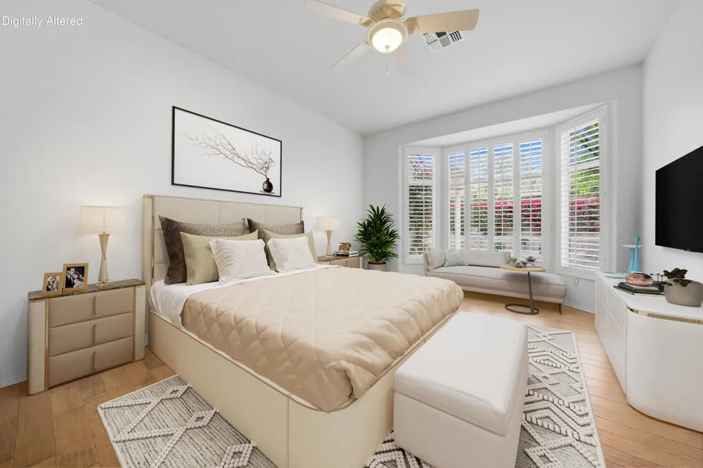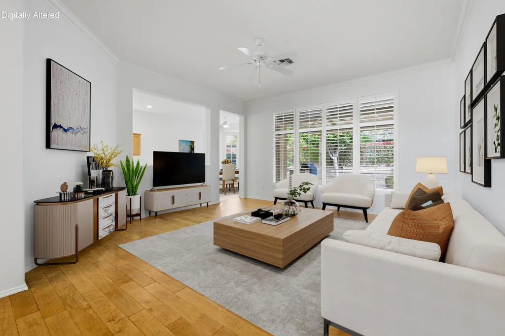 Sun City Palm Desert – Tangier. Ideally located between the Lakeview and Sunset View Clubhouses, this popular floorplan offers comfort, functionality, and easy desert living. The spacious north-facing rear yard features an extended patio with an aluamawood patio cover, lush desert landscaping with raised planters, and a built-in BBQ islanda”perfect for outdoor relaxation or entertaining. A gated front courtyard with patio adds both curb appeal and everyday usability. Inside, 10-foot ceilings and transom windows create a light and open atmosphere. Plantation shutters are found throughout, along with a tasteful mix of hardwood flooring in the living areas and bedrooms and tile flooring elsewhere. The kitchen is well appointed with Corian countertops, a breakfast bar, recipe windows, and cabinets with pull-out shelves. The den/office and living room are accented with crown molding, adding a refined touch. The primary suite features a bay window and a large walk-in closet, while the primary bath includes dual sinks, a glass-enclosed stall shower, and cultured marble surfaces. The extended guest bedroom offers French doors opening to the front courtyard and an adjacent bath with a shower/tub combination. Additional highlights include a laundry room with built-in storage and a separate closet, a new A/C installed in 2015, and an extended two-car garage with golf cart nook, built-in storage, and a work area.