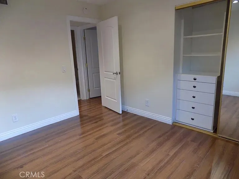 The floor plan features three bedrooms and two bathrooms, with mirrored closets in each bedroom. The primary suite includes a private bathroom and direct access to the backyard patio, creating a seamless indoor-outdoor flow.