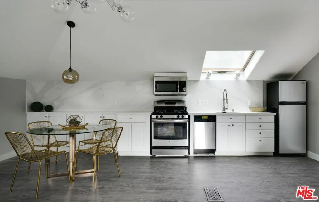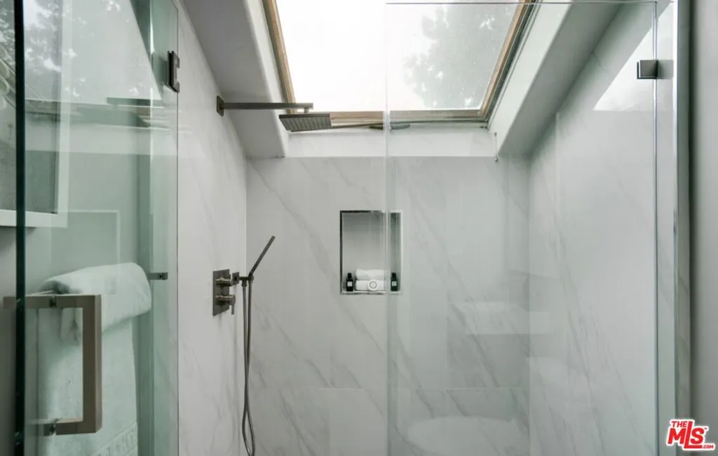 Set behind a large motor court on an expansive private lot, this fully furnished Paul Williams-style residence is a rare Beverly Hills retreat designed for effortless entertaining. The gracious main level unfolds through a formal living room with a fireplace and light-filled bay window, a formal dining room, and a secondary living room featuring a fireplace, custom built-ins, and disappearing glass doors that open directly to the outdoor living areas – creating a coveted indoor-outdoor flow. The marble-clad kitchen is outfitted with stainless steel appliances, including a Wolf range, and opens to a breakfast area, while a spiral staircase leads to the second level. Upstairs, the luxurious primary suite offers vaulted ceilings, a private balcony, and a spa-like en suite bath, complemented by well-appointed guest rooms throughout the home. Thoughtfully designer-decorated, the property includes five bedrooms and four-and-a-half baths, plus a fully detached one-bedroom guest house of approximately 700 square feet with its own kitchen. The resort-style grounds feature a full-size basketball court, pickleball court, pool, and direct private access to nearby hiking trails, all just moments from the best of Beverly Hills shopping, dining, and entertainment.