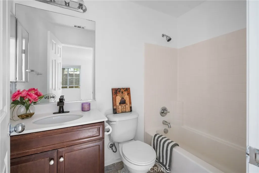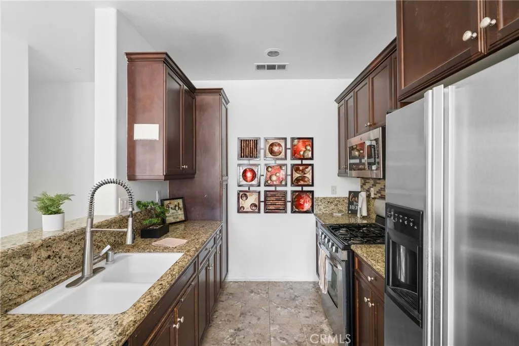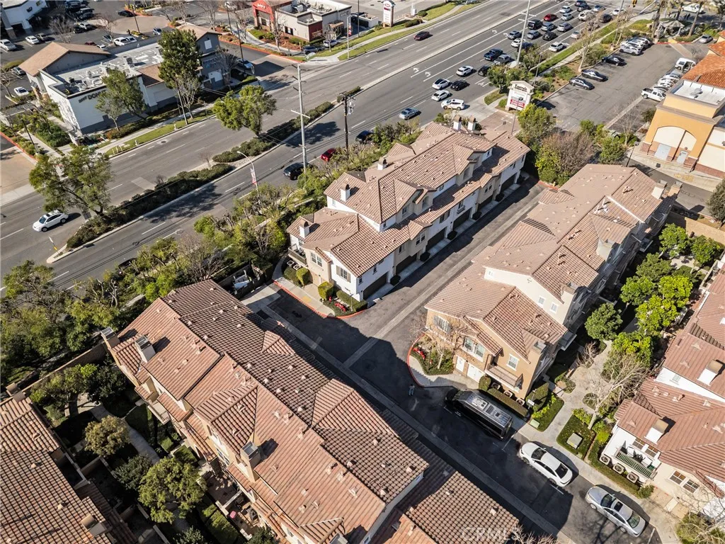 Highly desirable corner unit in a gated community with only one shared wall, offering exceptional privacy. This beautiful 2-bedroom, 2.5-bath home features a convenient downstairs bedroom with a full bath, ideal for guests or multi-generational living. Enjoy easy access with an attached 2-car garage. The bright, open floor plan is warm and inviting, highlighted by a cozy fireplace in the living room that adds an elegant touch. Upstairs, a private balcony off the loft area provides the perfect space to relax. Move-in ready and fully equipped with all appliances included, including washer, dryer, and refrigerator. Located within top-rated schools, including Eleanor Roosevelt High School, and conveniently close to the 15 and 60 freeways for an easy commute. Just minutes from Costco, major shopping centers, fine dining, and entertainment. The HOA includes water and trash and offers resort-style amenities such as a pool, jacuzzi, basketball court, playground, and BBQ area. Property is VA approved!