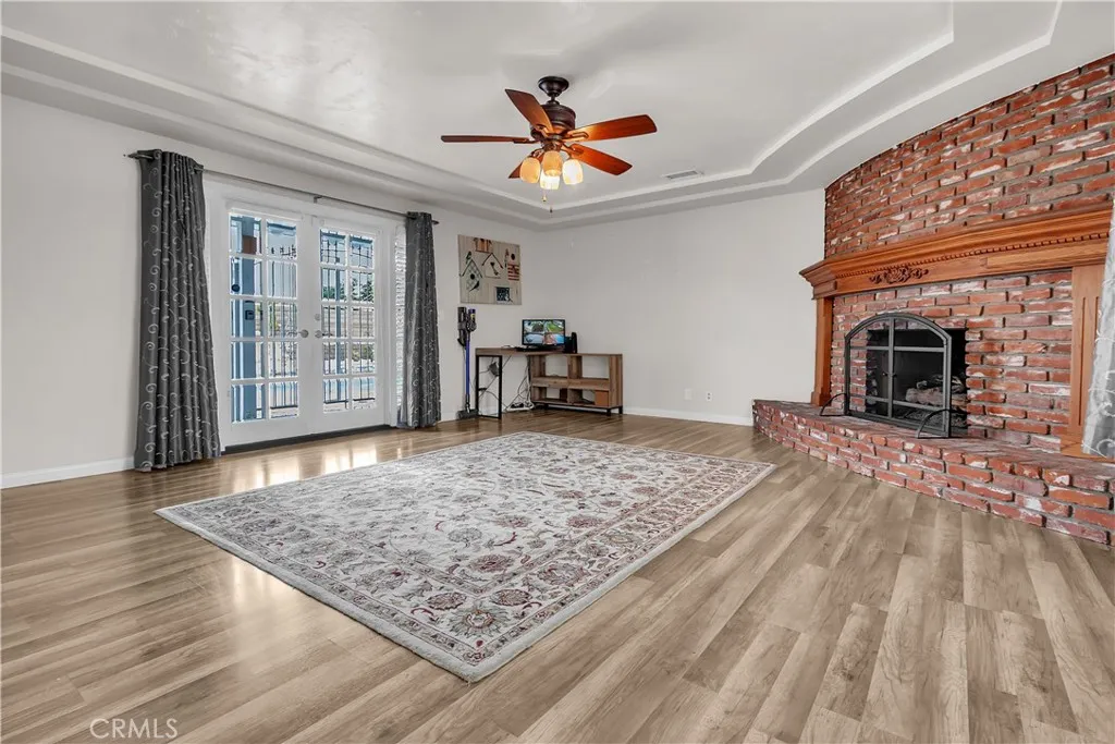 A large Family Room anchors the heart of the home, featuring a charming brick fireplace with wood mantle and French doors with operable sidelights that open to the patio and pool area—perfect for gatherings or quiet evenings at home.