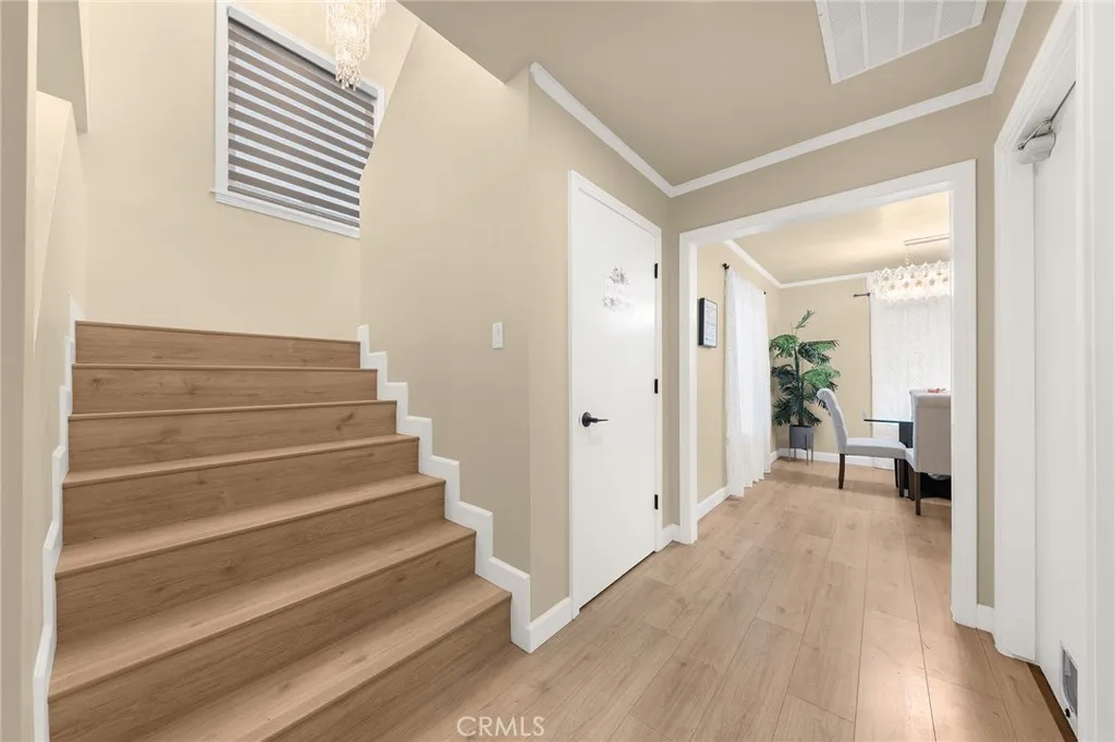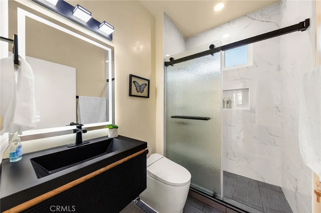 Step inside to admire the custom-made, imported crystal chandeliers with adjustable lighting and the living room’s unique ceiling design. The office seamlessly connects to the private rooftop deck, ensuring that every room is both spacious and filled with natural light. Enjoy amenities like skylights, smart home appliances and toilets, LED mirrors, and a walk-in closet. The waterfall-style island platform serves as a stunning centerpiece in the kitchen, while the spacious staircase is adorned with large tempered safety glass. Additional features include a double garage with epoxy flooring.Termite completed .