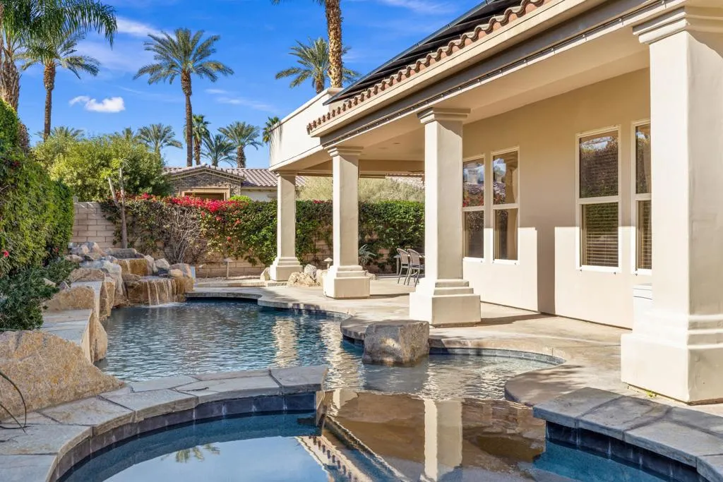 Welcome to Via Fiore, a stunning property located in the sought-after Indian Wells, CA. This luxurious home is nestled within Montelena, a secure gated community, and showcases an expansive layout on an impressive 10,019 square foot corner lot. Montelena is an immaculately kept gated community and combines privacy with security and benefits from low HOA fees. Its prime location is just steps from the Montelena private walking gate to the Tommy Bahama Miramonte Resort and close to exclusive golf clubs. As a resident of Indian Wells you enjoy special discounts at the Indian Wells Golf Resort, BNP Paribas Open, and all four Indian Wells resort properties.Upon entering the home, you’ll be greeted by an open floor plan that seamlessly combines elegance and comfort. The spacious area provides ample room for relaxation or entertainment. The large kitchen, complete with modern appliances, plenty of storage space, and a walk-in pantry, is perfect for culinary enthusiasts who enjoy preparing delicious meals.The residence boasts three bedrooms and four bathrooms designed with thoughtful details to ensure your utmost comfort. The primary bedroom includes a large walk-in closets providing ample storage for personal items. The main guest bedroom is set up as an in-law suite with a built in kitchenette. A second on-suite guest bedroom and a separate office round out the design.The outside of this home is just as appealing as its interior. A south-facing backyard awaits where you can soak up the California sunshine. The recently renovated pool and spa offer an inviting spot to relax or entertain guests. An additional feature that sets this property apart is the sunken outdoor kitchen – ideal for hosting memorable gatherings amidst beautiful surroundings.This exceptional property also comes with a current rental agreement through 2026, with an option for extension into 2027 – making it a potentially lucrative investment opportunity.