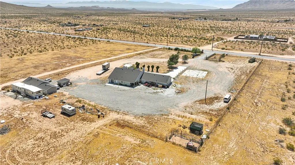 Own your own ranch in North Apple Valley. This home is located on over 9 acres of land (partially fenced), has views in all directions. Main house offers a huge living room with fireplace, a 3 car garage, a formal dining room, and a spacious kitchen and a LARGE ISLAND! Back house offers 1,100 sq ft of living space; 2 bedroom 2 bath. This property is in the specific plan for Apple Valley’s Commercial / Industrial Development. Less than a mile from the Walmart Distribution Ctr and Big Lots Dist., approx 1 mile from BrightLine train (coming soon) and the 15 freeway.