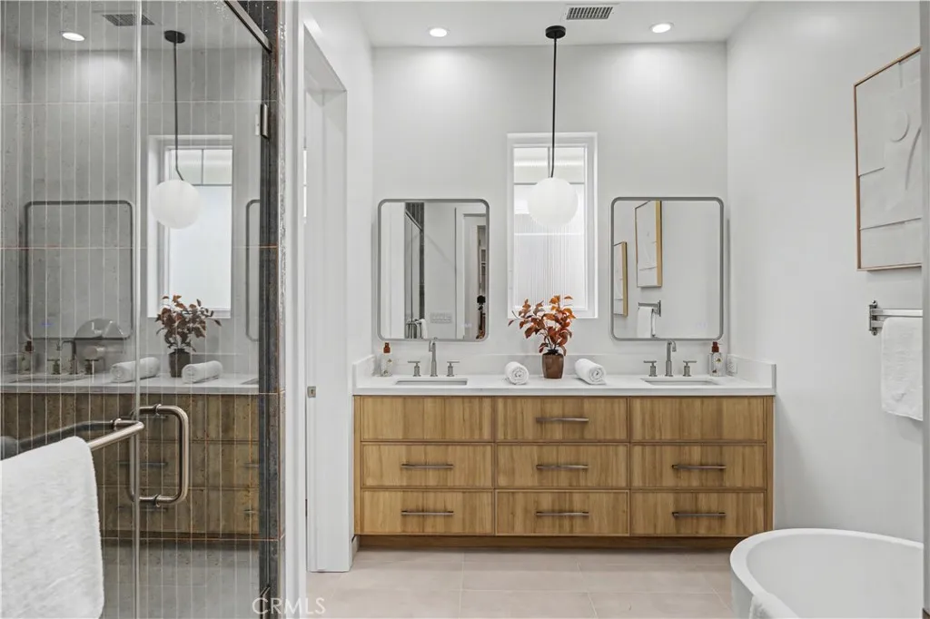 Downstairs, the reverse floor plan creates a sense of privacy and calm, with the bedrooms thoughtfully separated from the main living spaces. The primary suite serves as a peaceful sanctuary, offering a restorative escape at the end of the day. The spa-inspired bath features a luxurious soaking tub, a sleek walk-in shower, and elegant finishes that evoke comfort and indulgence. Spacious walk-in closets provide ample storage while preserving the suite’s refined feel.