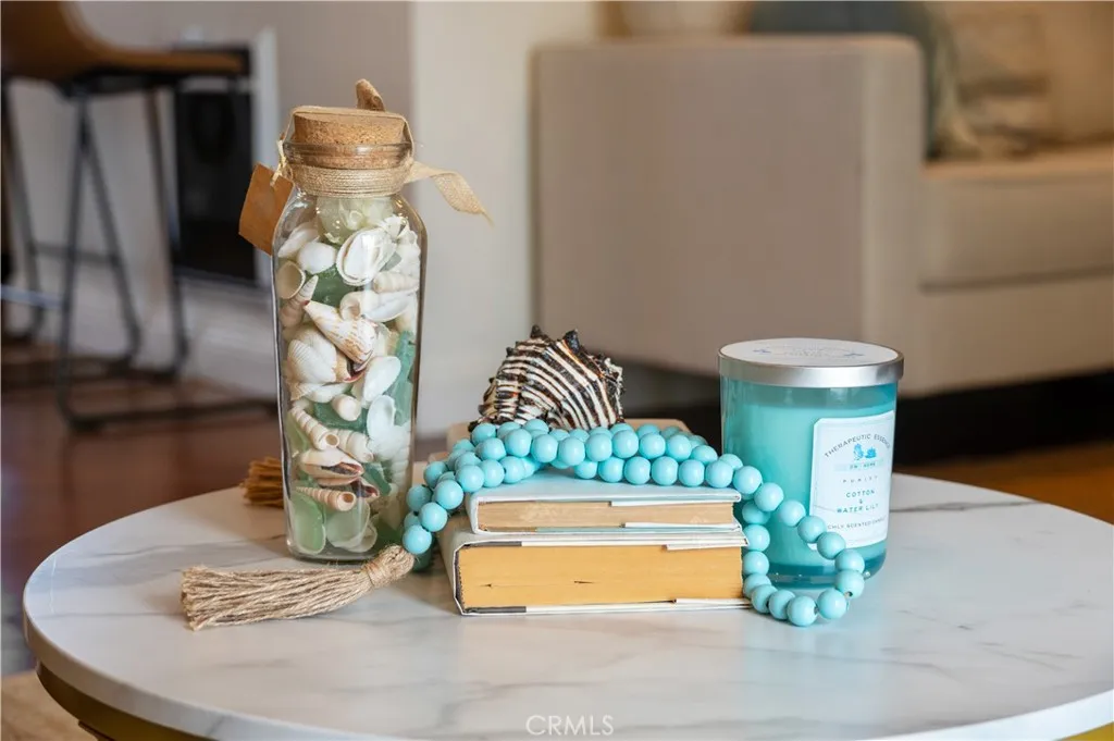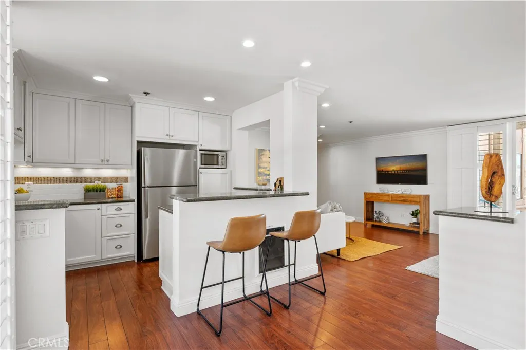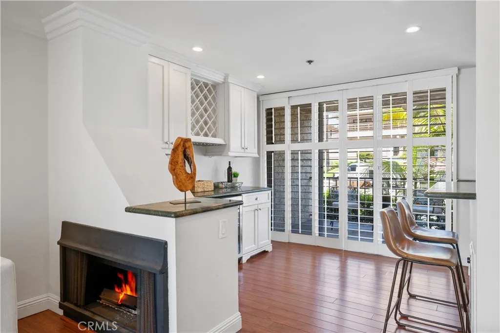 Step inside to a bright, open floor plan where wide-plank floors, plantation shutters, recessed lighting, and fresh coastal tones create an inviting, airy feel. The living room, complete with a cozy gas fireplace, opens directly to the deck and offers partial ocean views. The remodeled kitchen is thoughtfully designed with stone countertops, white cabinetry, a tile backsplash, and stainless steel appliances. The dining area features built-ins, a buffet, and a wine fridge—perfect for easy entertaining.