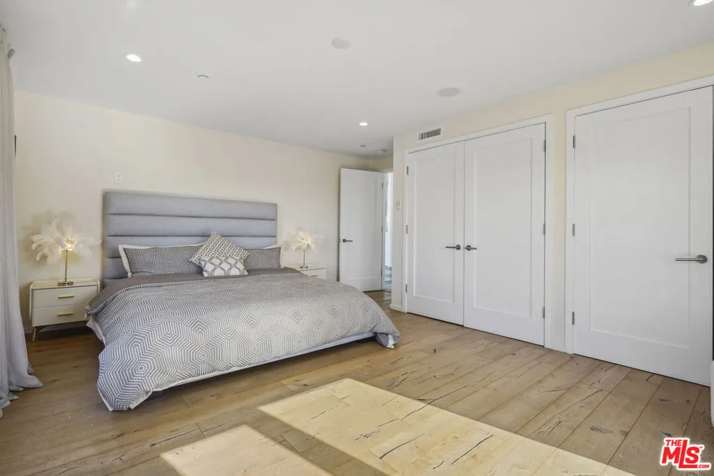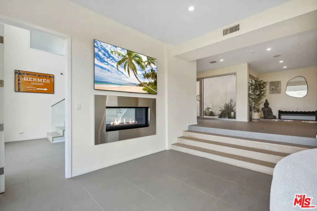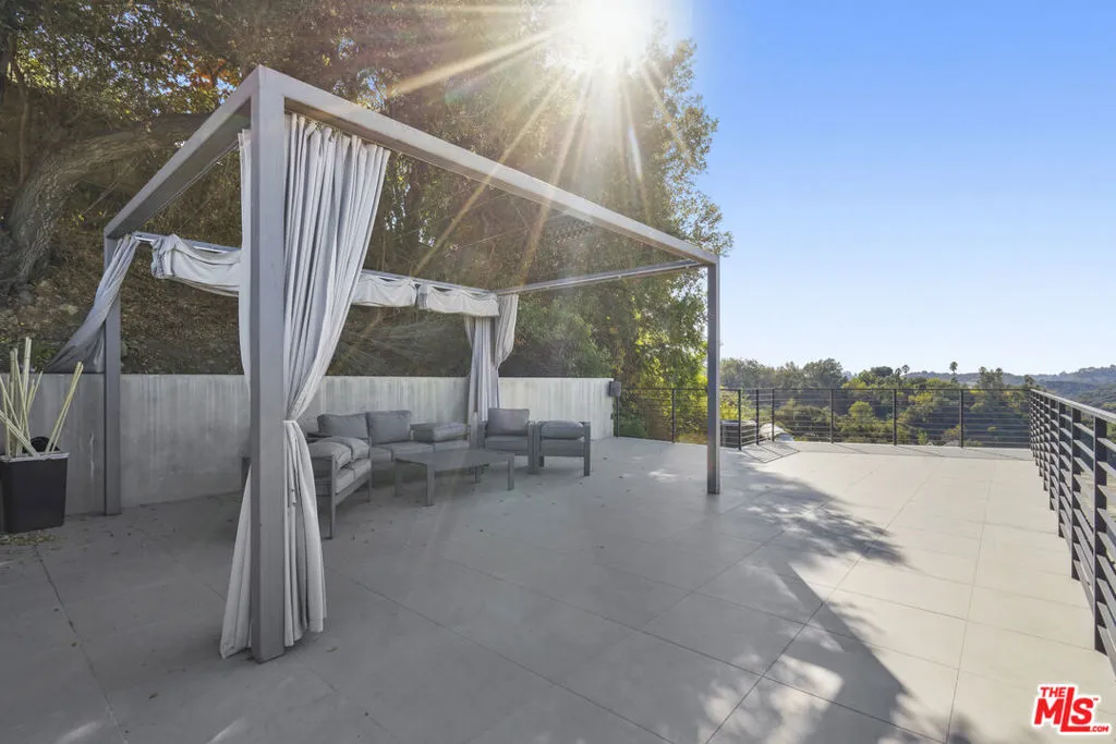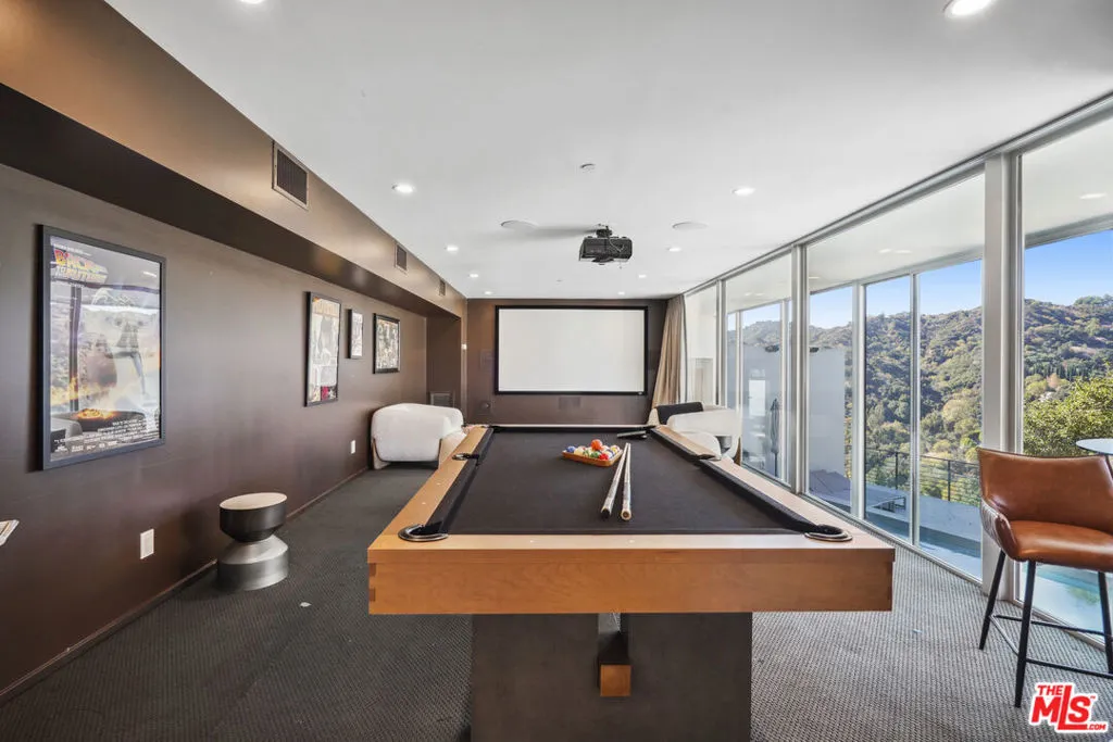 Suspended above the city within one of Beverly Hills’ most exclusive, celebrity-favored gated enclaves, 9716 Oak Pass Road is a striking contemporary estate offering exceptional privacy, architectural distinction, and breathtaking panoramic views. The community is gated, and the residence itself is further secured behind its own private gate and drive, creating a rare and dramatic sense of arrival. Spanning approximately 6,244 square feet across three dramatic levels, this modern sanctuary is wrapped in walls of glass that capture canyon vistas from nearly every room, delivering a seamless indoor-outdoor lifestyle throughout. A signature architectural highlight is the glass-enclosed skybridge hallway suspended above the infinity-edge pool, serving as a sculptural centerpiece on the main level and elevating the home to true statement-level design. The residence offers a total of four bedrooms, including an expansive and private primary suite retreat with commanding views, oversized walk-in closets, and a spa-inspired bath. Three additional guest bedroom suites provide exceptional comfort and privacy. Designed for both refined daily living and elevated entertaining, the home features a gourmet chef’s kitchen, sophisticated formal and informal living areas, a private executive office anchored by a dual-sided fireplace, and a dedicated private theatre/media room. Multiple view terraces and decks extend the living experience outdoors, while the floating infinity-edge pool appears to merge with the skyline, creating a resort-style setting high above Beverly Hills. Set among notable neighbors within an elite and discreet hillside enclave, this exceptional contemporary residence delivers a rare combination of privacy, prestige, and iconic architecture on one of Beverly Hills’ most coveted streets.