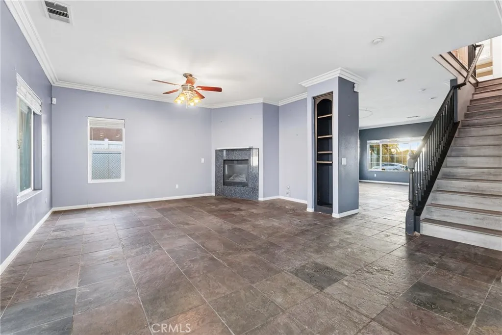 The inviting living room features a cozy fireplace, while the separate family room provides additional space for everyday living and entertaining. The upgraded kitchen is a true centerpiece, complete with an expanded waterfall island, double ovens, stainless steel appliances, and a walk-in pantry—perfect for both cooking and hosting. Elegant crown molding flows throughout the home, adding a refined touch to every room. Slate flooring throughout the downstairs.