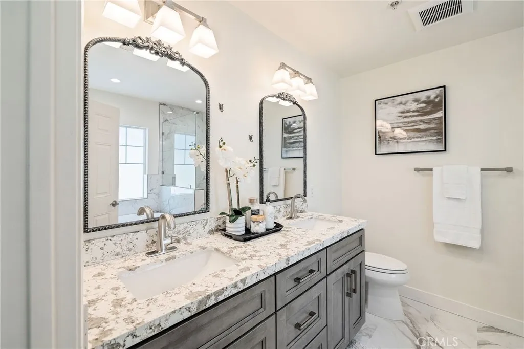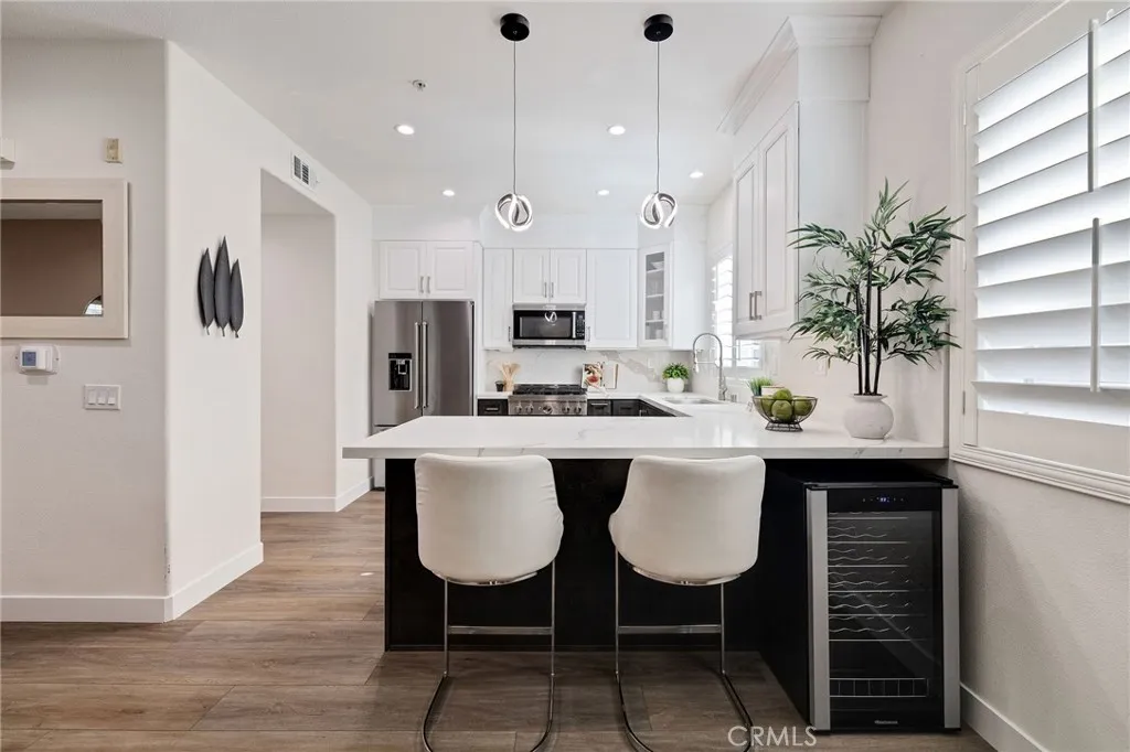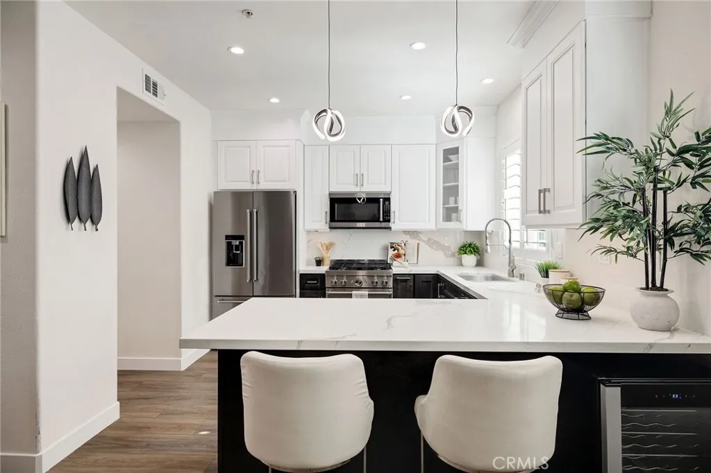 Love at first sight. This stunning, picture-perfect 4 bedrooms, 3.5 bath townhome is nestled in the gated community of Stonehaven. This exceptional home with high ceilings and lots of natural light is exquisitely designed and meticulously remodeled with modern upgrades and charm. The front door greets you to a formal entry and welcomes you to the main floor featuring the living room, a formal dining area, a breathtaking kitchen with breakfast bar, a culinary delight, designed with style and functionality, stainless steel appliances including a Kitchen-Aid commercial style range, microwave hood combo, French door refrigerator with filtered water system and a pantry. A guest bathroom completes this floor. Stairs lead you to the upper level boasting a spacious primary suite with walk-in-closet and a gorgeously designed bathroom with double sink vanity, separate shower and a soaking tub. Two well-appointed additional bedrooms that share a full bathroom with tub and shower complete this level. On the lower level, you will find a conveniently located fourth bedroom and a bathroom with shower, ideal as a private office or guest room. A large two car attached garage with direct access, laundry hookups, Shelves and Lift Master WI-FI garage door opener completes this level. Other outstanding features include gorgeous SPC flooring on first, second, third levels and stairs, Newer PEX repiping, additional insulation, central heating and air conditioning, recessed lighting, eight upgraded Simonton windows, shutters, a very cozy patio, and ample storage and cabinets.This is a home to create memories for many years to come. Destined to win your heart.