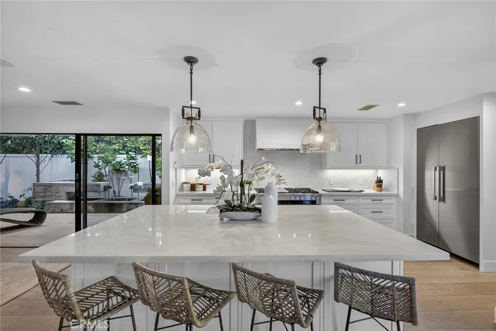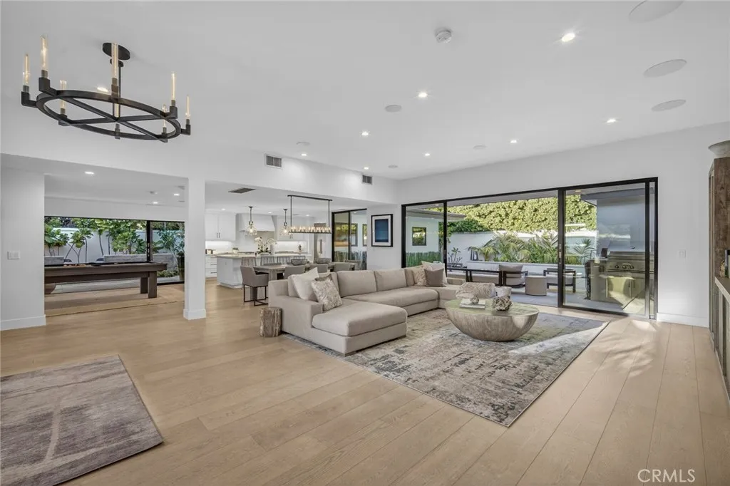 A beautiful entry atrium leads into an open great room filled with natural light and thoughtfully connected to the outdoors at multiple points. Smooth-coat walls, clean detailing, and carefully selected materials reinforce the home’s refined, contemporary feel throughout. The kitchen is outfitted with Miele appliances and integrates seamlessly with the living and dining areas, making it equally well suited for everyday living and larger-scale entertaining. The true centerpiece of the home is the dramatic living room, featuring soaring 12-foot ceilings, expansive Fleetwood windows and doors, oversized sliders oriented to the ocean views, an 8-foot glass fireplace, and a built-in wet bar. The open layout was intentionally designed to maximize light, flow, and indoor-outdoor living through versatile, interconnected spaces.