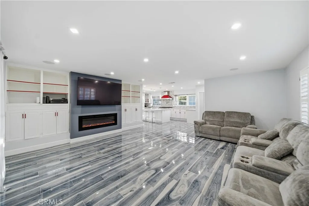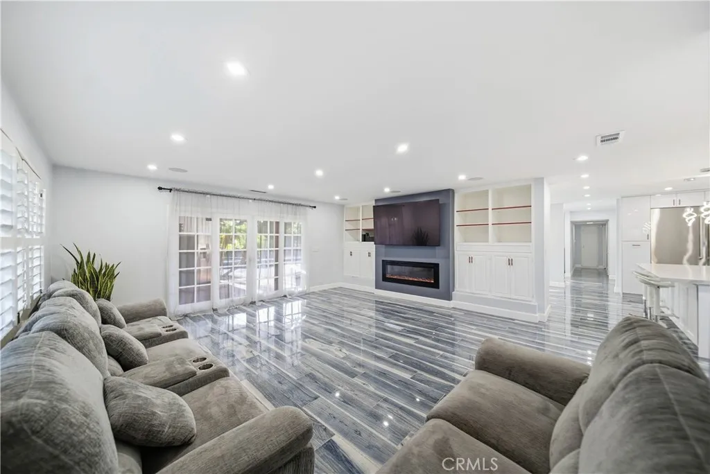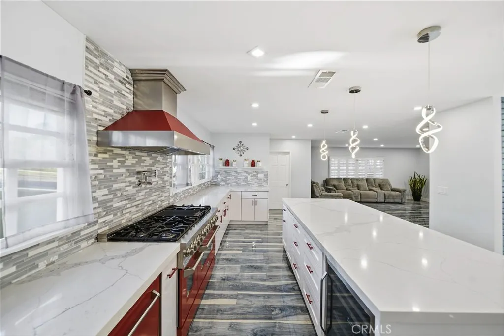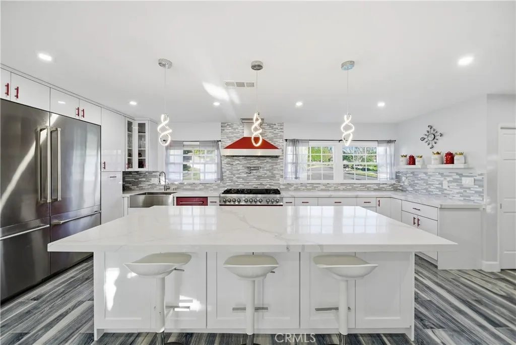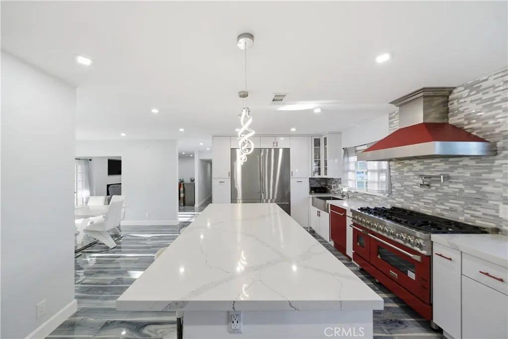 OVER $50,000 price cut! Brand new roof, solar panels in place, ADU potential (ADU plans and drawings available), and a prime location that continues to be a favorite among Northridge buyers. Sprawling single story living in the desirable Scottish Terrace Estates. Nearly 2,800 square feet, all on one level, with elegant porcelain wood-look tile flooring throughout. Step inside to a wide open floor plan designed for both everyday living and entertaining. The gourmet kitchen is positioned at the front of the home and serves as a true focal point. This chef-inspired kitchen is thoughtfully appointed with a high-end ZLINE appliance package, featuring a stainless steel 7-burner double-oven range with statement hood, ZLINE dishwasher, stainless steel farmhouse sink, trash compactor, pot filler, built-in luxury refrigerator, and wine cooler. White cabinetry is elevated with bold red hardware accents, complemented by quartz countertops and a modern gray-toned tile backsplash. The open concept layout flows seamlessly from the kitchen into the family room, formal living room, and dining area. Designed for an indoor-outdoor lifestyle, sliding doors from the main living spaces open to a private backyard retreat featuring a pool and spa, lush greenery, usable lawn, and a massive covered patio with vaulted ceilings. The home offers four bedrooms and three bathrooms. The bath is a standout, featuring a massive glass enclosed wet room with a freestanding soaking tub set against a floor to ceiling tile wall. High-end finishes include sleek matte black hardware and LED backlit mirrors over dual vanities. Situated on a corner lot, this true single story ranch offers a wrap-around lawn, wide concrete driveway, and detached two car garage enhancing both privacy and ADU potential. The home also features a convenient indoor laundry room with washer and dryer hookups and a utility sink for added functionality. A rare opportunity offering space, flexibility, and timeless single level living, ready for its next owner.