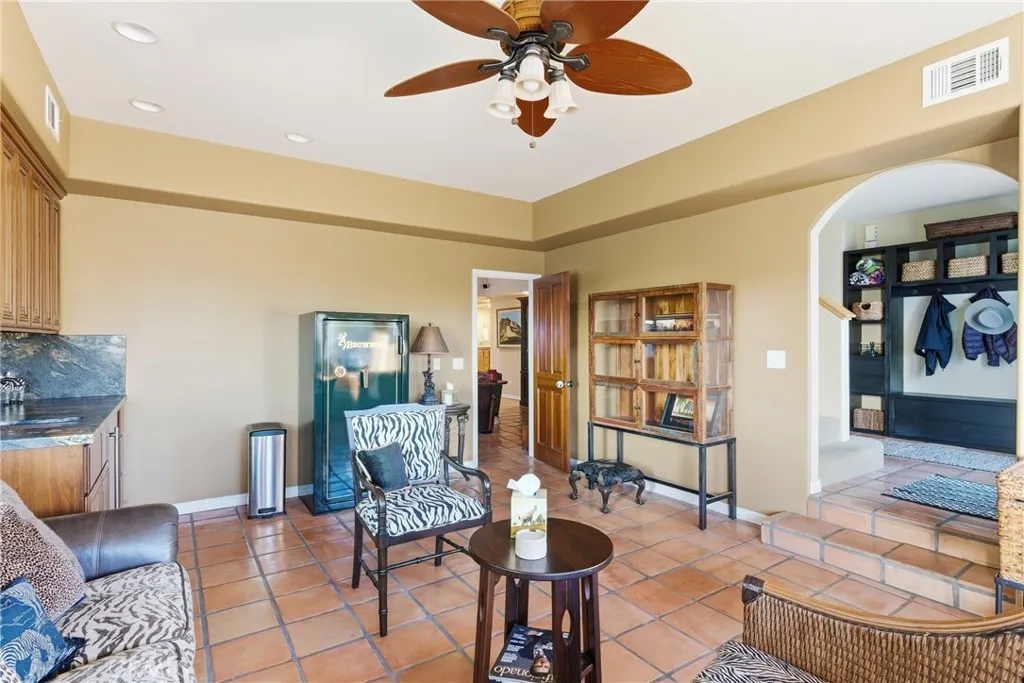 The oversized office includes a wet bar with leathered granite countertops and custom built-in cabinetry, ideal for a home office, media room, or guest retreat. Outdoor living shines with a custom front-yard waterfall and gas fire pit, while the backyard boasts a large Trex deck overlooking peaceful open space and wildlife. The outdoor beach shower, jacuzzi hot tub and large storage shed add even more value.