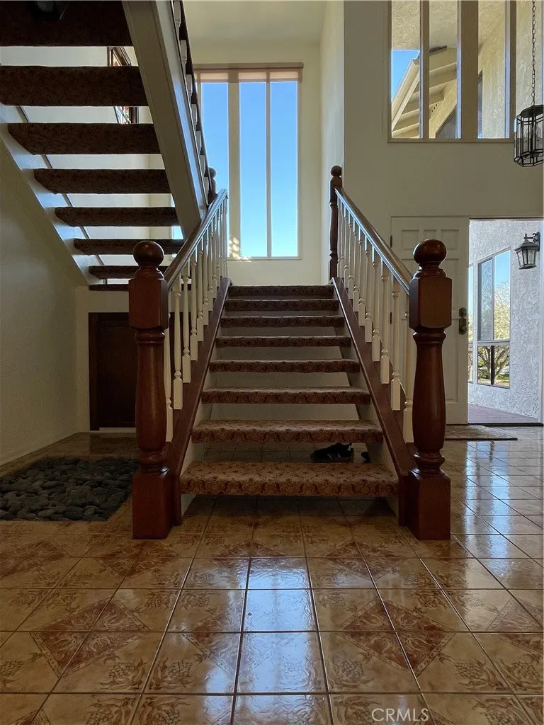 A striking staircase near the entry is flanked by large windows, creating a bright and inviting ascent to the upper level. Upstairs, you’ll find three additional bedrooms and a full bathroom, all overlooking the expansive backyard. The outdoor space features a flat grassy area that transitions into a lush, gently sloping hillside, offering privacy and scenic views. An upstairs balcony provides a peaceful vantage point to enjoy the surrounding landscape.