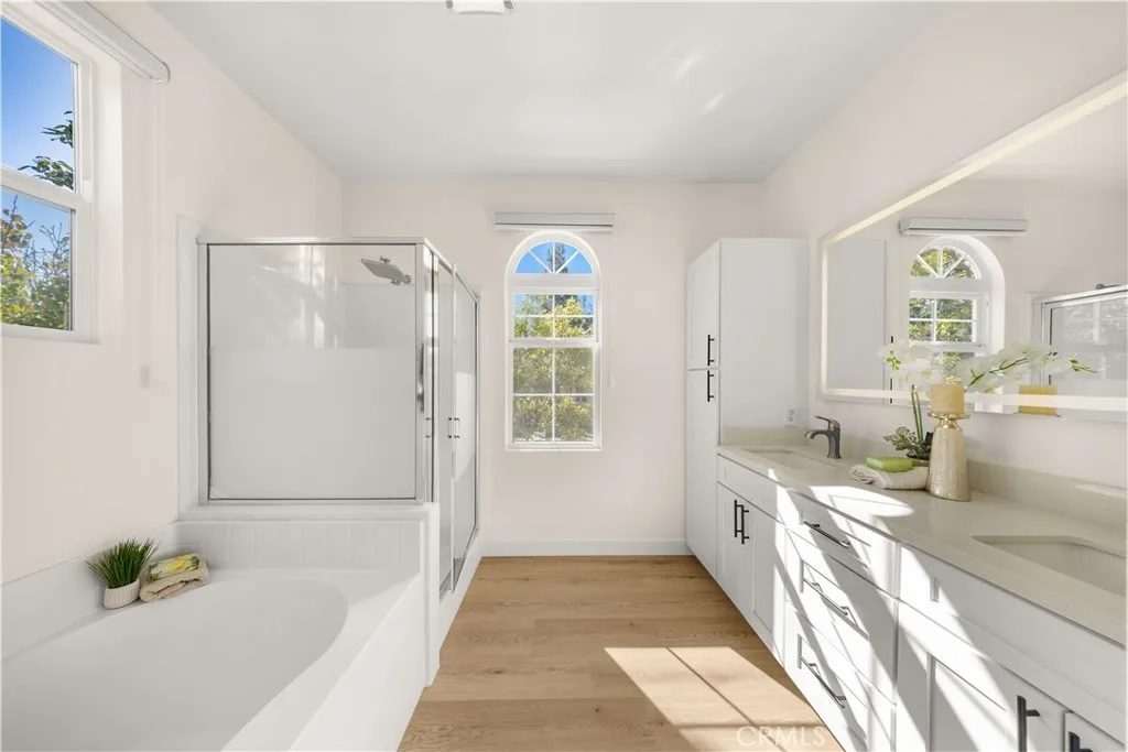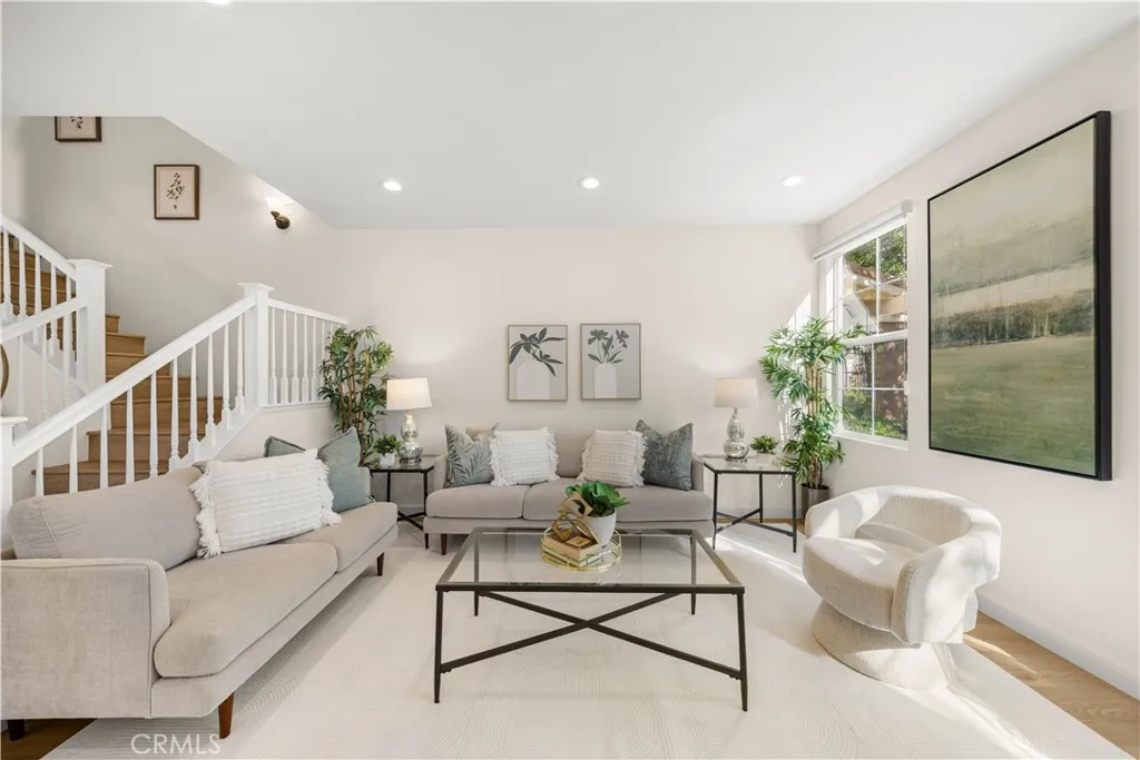 This spacious and sunlight unit features a great floorplan with high ceilings, large living room with a modern fireplace, nice wood floors upstairs and downstairs, shaker cabinets with stainless steel appliances, sharp shite counters in kitchen, counter seating next to a private dining area, guest bathroom, laundry room and attached 2-car garage with a huge storage area. The second floor features the master-suite with a walk-in closet and a spa-like master bathroom, the two guest bedrooms and a full bathroom with double sinks. The two guest bedrooms, kitchen, and the dining room face to south, and living room and master bedroom face to east, so the property is always full of sun light. The sellers also add LED recessed lighting throughout. The property has a large private patio and a pool view.