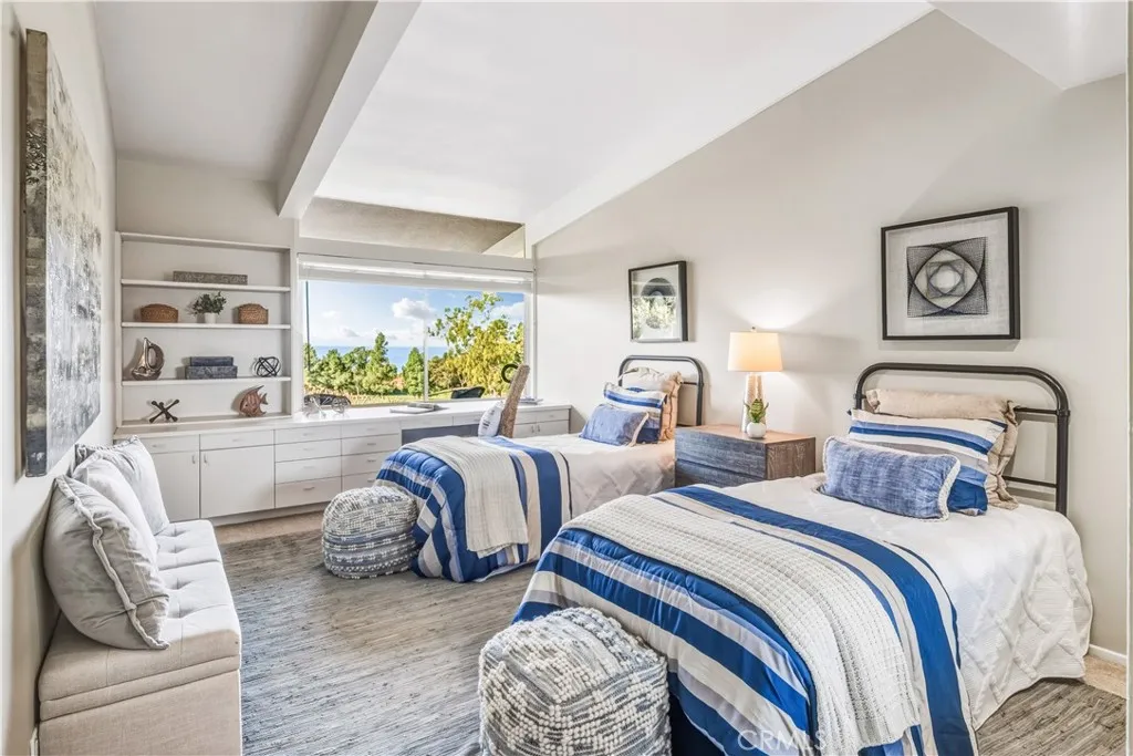 VIEWS, VIEWS, VIEWS! This elegant One-level mid century estate boasts Panoramic Ocean and Golf course views from almost every room. Located on a serene cul-de-sac, this view home offers tranquil living in the prestigious Country club neighborhood. Upon entering the gate, a private courtyard with a beautiful pool leading to a double-door entrance into a stunning foyer. You will be greeted by a breathtaking view and the expansive sunken living room with walls of glass. Soaring beamed ceilings and expansive windows/doors fill the home with natural light, accentuate the open living space. The graceful living room features beautiful travertine floor, a grand fireplace and sliding doors that open to a view patio. The formal dining room is perfect for entertaining, ideal for hosting unforgettable gatherings while enjoy stunning Sunset views. Remodeled Kitchen completes with a cozy dining nook. The two versatile family rooms are very spacious, ready to transform into the places suit your lifestyle, such as home entertainment, home office, game room etc. Three generously sized bedrooms in a separate wing, while the primary suite set apart off the entry hall, features a dressing area, en-suite bathroom and a private atrium patio. There is a cozy library/bedroom with a fireplace provide additional living space, with sliding doors opening to back patio. This exceptional home is also close to award-winning Palos Verdes schools, park, and trails. With its enviable floor plan, coveted location and world class views, this special home is ready for you to make it your own sanctuary.