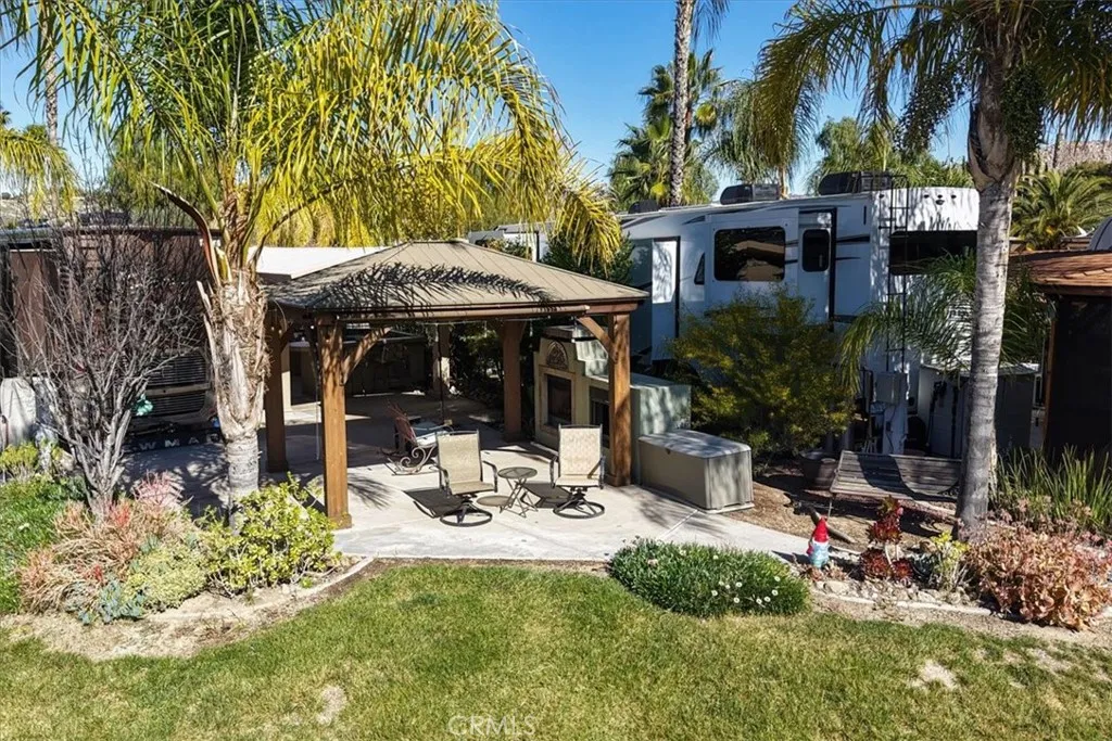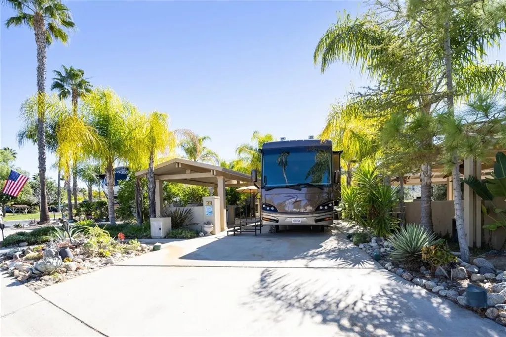 The outdoor living space is exceptionally well designed, featuring two shade structures: a gable-style aluminum wood cover for timeless durability and a massive pergola that creates a grand, resort-style atmosphere. Multiple ceiling fans ensure comfort year-round, making this space ideal for relaxing or hosting unforgettable gatherings. At the heart of the lot is a fully built-in outdoor kitchen equipped with a barbecue, stovetop, dishwasher, refrigerator, built-in countertop cooler, double sink, and a stunning tile island with matching tile countertops—perfect for casual dining, entertaining, or sunset cocktails with a view. Additional highlights include a fireplace for cozy evenings, a custom TV cabinet cover for outdoor entertainment, ample storage, and a large lot layout that offers both functionality and privacy. The property is completed with gorgeous front curb appeal, setting the tone the moment you arrive. This is more than a lot—it’s a resort-style lifestyle, combining panoramic scenery, high-end amenities, and thoughtful design in one exceptional offering. Rancho California RV Resort enriches your lifestyle with a host of top-tier amenities. Owners enjoy a 14-hole executive par-3 golf course at no extra cost, along with access to five pools and jacuzzis, tennis and pickleball courts, a dog park, two clubhouses, a fitness center, a fishing pond, horseshoes, and a bocce ball area. The resort is guard-gated with no age restriction, ensuring a welcoming environment for all. Monthly HOA fees cover unlimited use of the golf course, all amenities, trash pickup, and water, sewer, and common area maintenance. With financing available, the RV Resort offers the perfect blend of a private property lifestyle and a vibrant community atmosphere.