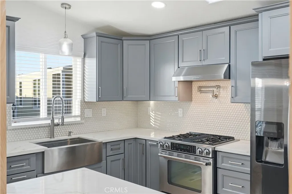 The updated kitchen features stylish gray cabinetry, quartz countertops, a center island with seating, stainless steel appliances, and a beautiful tile backsplash—perfect for entertaining or everyday living. Skylights and large windows enhance the airy feel of the space.