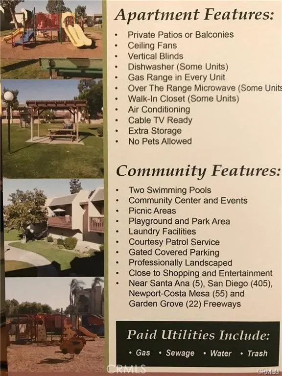GREAT INVESTOR’S OPPORTUNITY…..There are 3 UNITS TO BE SOLD TOGETHER. All Condos are ON THE 1ST FLOOR with 1 bedroom 1 bath with ALL newer TILE FLOORS, NEW PAINT, CORIAN COUNTERS, STOVE, updated Bathroom, in-wall AC. UNITS IN COMPLEX ARE CURRENTLY BEING RENTED FOR $2100/MO. HOA Dues pay for Water, Gas, Trash, Labor inside the Unit for Maintenance Only, Landscape, Exterior Lighting and Insurance. Office takes care of rentals for Owners. Other Condo Units are A112 and A111, Sold for $329,000 each an Amazing Investment for all 3 at $987,000 total. JUST MINUTES TO THE SANTA ANA METROPOLITAN DISTRICT AND VERY CLOSE TO THE 5 AND 55 FREEWAYS!