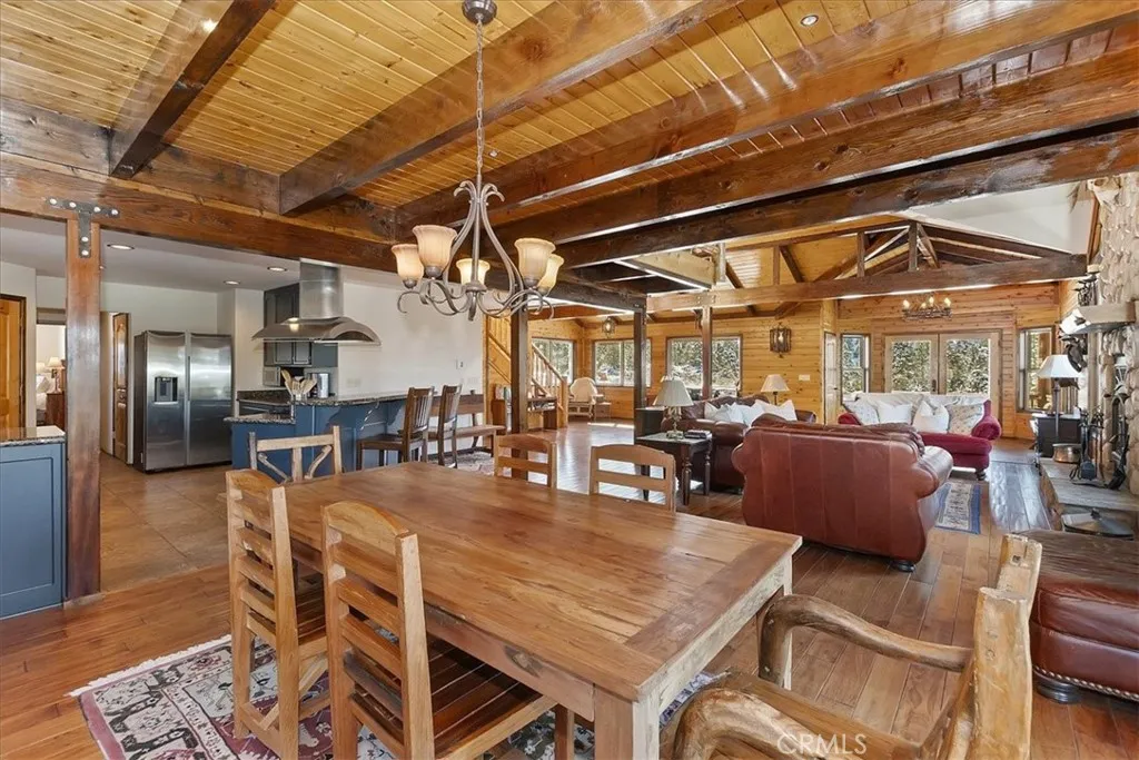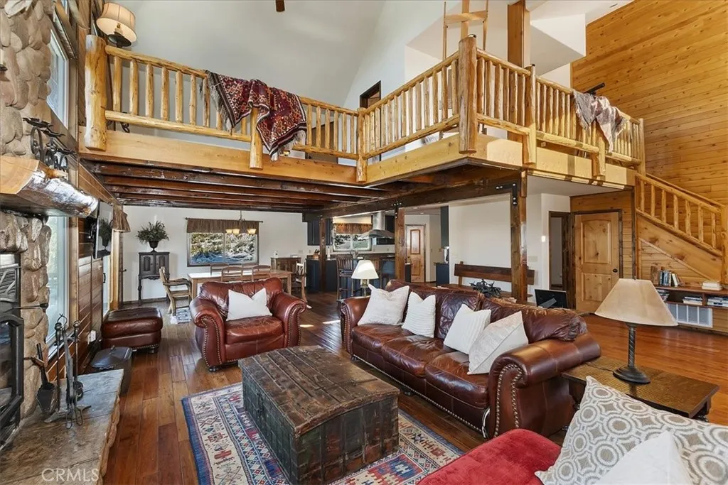 feet. Features include a spacious open floor plan, a floor-to-ceiling rock fireplace in the living room,