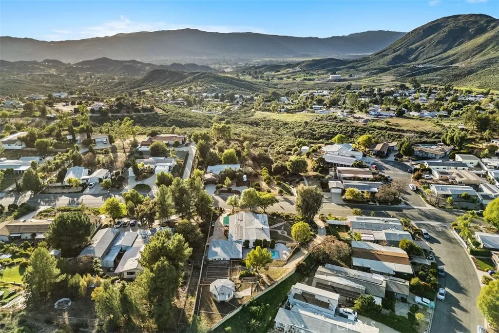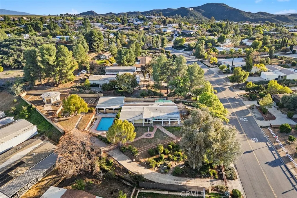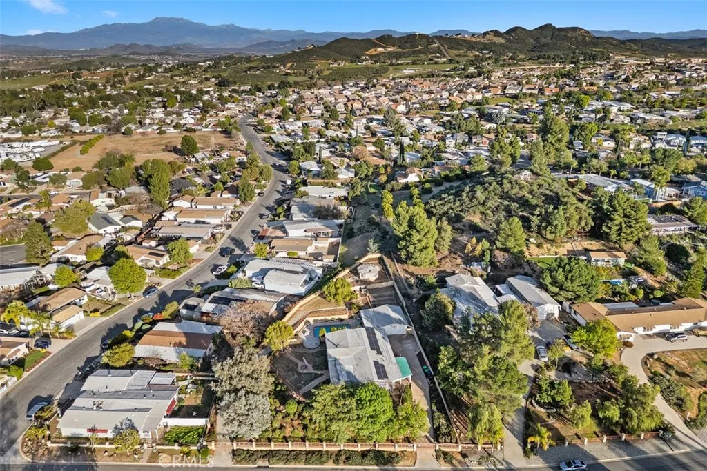 Welcome to “The Farm” in Wildomar. Enjoy 600 acres of common area, 38 acres of citrus groves, pools, spas, sport facilities, a fishing pond, hiking trails from this well managed community in southwest Riverside. This 3 bedroom, 2 bathroom is almost 2,000 square feet and located on one of the largest lots in the community at .7 acres. This elevated lot offers soaring views of the surrounding mountains, hills, and neighborhood. Enjoy your own private pool, gazebo, oversized detached garage, space for gardens and much more. This home is also energy efficient with a owned solar system to provide electrify, dual paned windows, and energy efficient appliances. You will find newer flooring in the living room and dining room, as well as through out the kitchen. The kitchen was remodeled and has quartz counters, kitchen island, plenty of cabinets, stainless steel appliances and opens to the great room. The primary bedroom has a private bathroom, and access to the backyard and pool area. A utility room at the back of the home is the perfect place for an office, den, or potentially a 4th bedroom. There are two driveways to the property and it is completely fenced and secure. A few cosmetic upgrades will makes this home turnkey.
