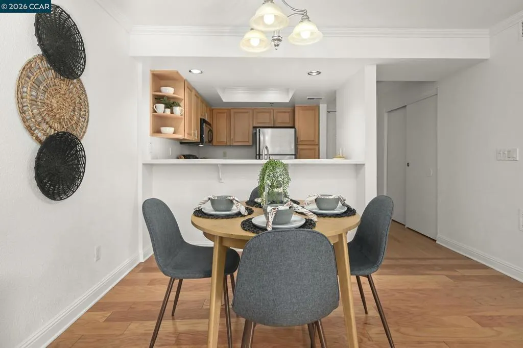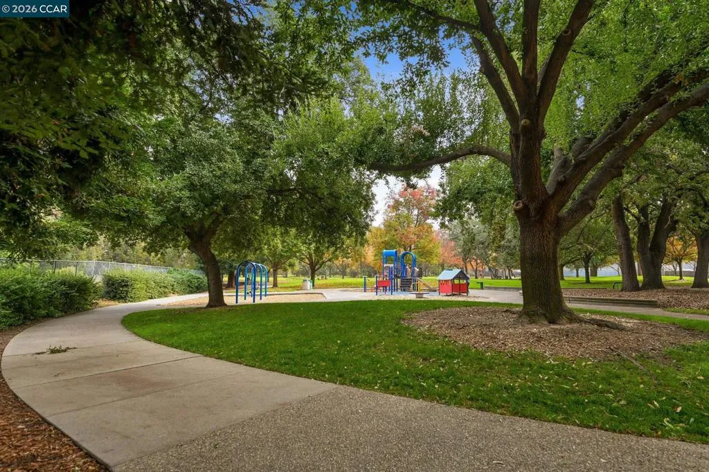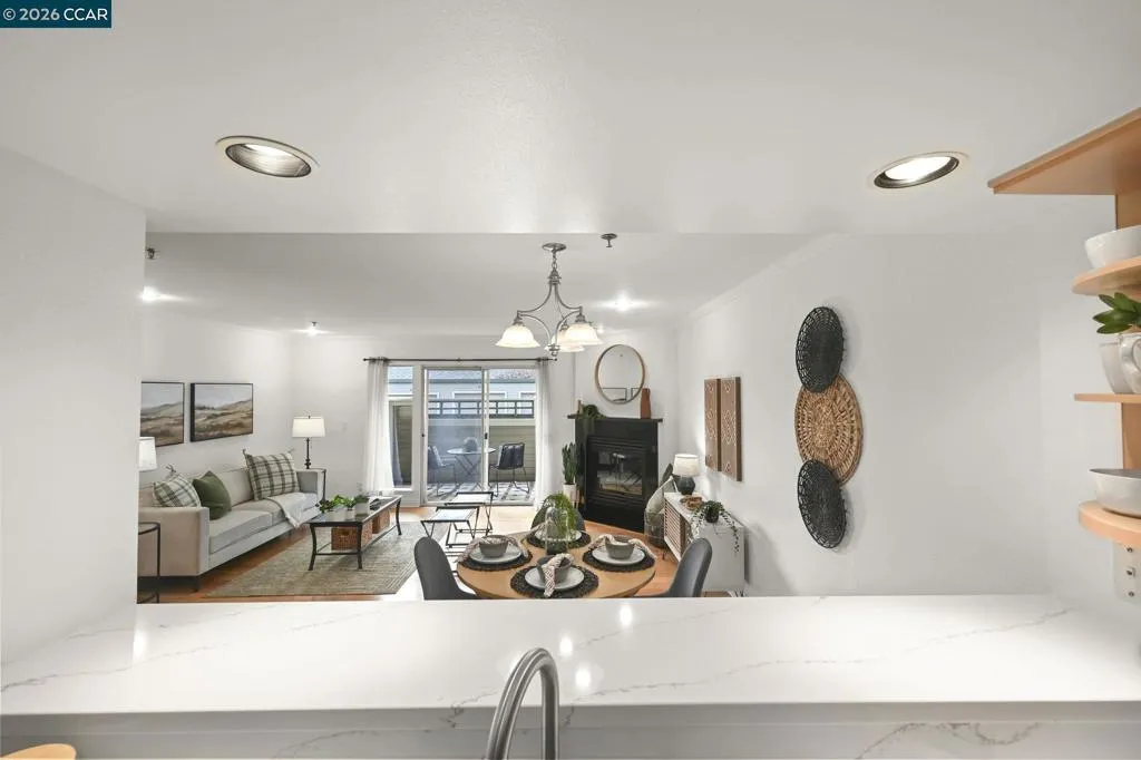 Start your day with a cup of coffee in this light and airy end unit, perfectly tucked away at the back of the complex—so you can relax in peace without street noise. The spacious kitchen offers lots of storage and plenty of room for cooking. The open-concept living area flows seamlessly into the dining space, featuring a cozy gas fireplace that adds warmth and charm. The primary bedroom features an ensuite bathroom and plenty of closet space. 2nd bedroom and hall bath is perfect for guests. Convenient inside laundry and additional closet space. Also includes a private 1 car garage. Easy to access this level in unit with no stairs to entry. Enjoy the amenities with beautiful pool, spa, and BBQ area. Fabulous location close to BART, schools, parks, shopping and freeway access.