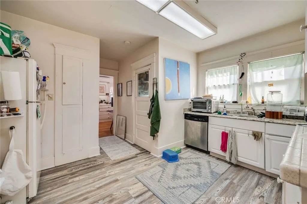 The attractive front unit is highlighted with a remodeled kitchen and full bathroom, laminate flooring, spacious living room with fireplace, attached alcove reading room to the living room, abundant light flowing into a classic dining room with vintage display cabinetry, den / office which could be used as a third bedroom, separate laundry room with washer and dryer hookups, stove / refrigerator / dishwasher included, mini split HVAC’s in each bedroom, off-street parking, freestanding barbeque, walk-in closet, and hallway/attic fan to quickly expel hot air when needed.