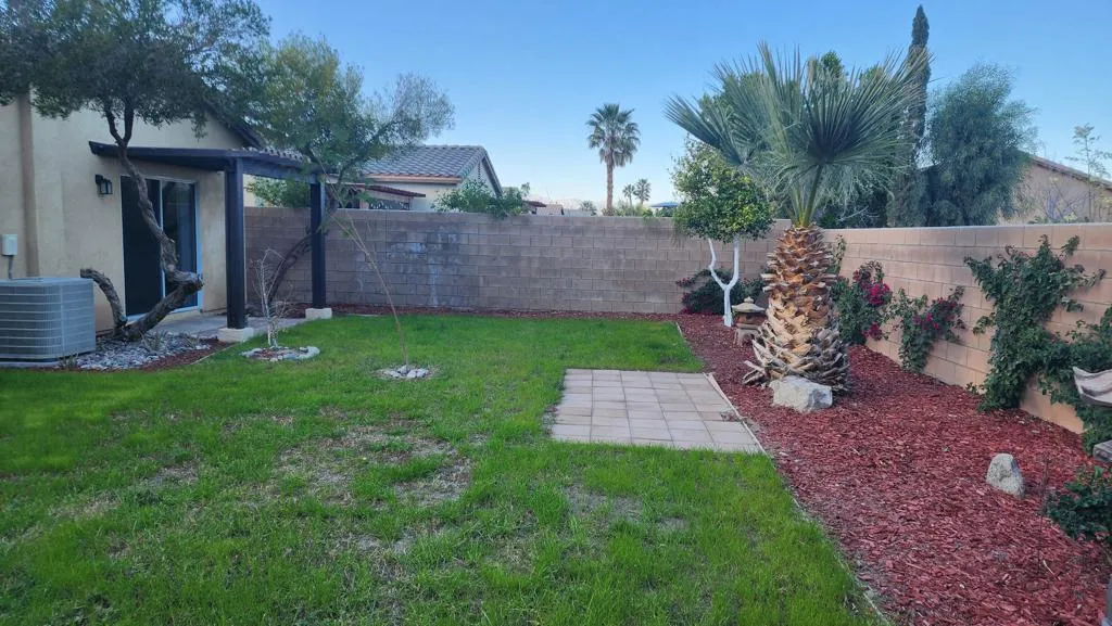 Move in ready, just grab your toothbrush! Spacious great room floorplan has gas fireplace with modern glass pebbles, ceiling fan, and large island with bar seating. Kitchen has Stainless steel appliances and large pantry. Inside laundry room leads to 2 car attached garage. Large backyard has newly planted fruit trees and patio cover was just restored and painted. Family Community has super low HOA dues with amenities that include 3 pools and spas, tennis courts, basketball court, BBQ area, picnic area, playground, roving security. Located just off Palm Canyon, a short drive to shopping, dining, entertainment, and the PS Tram. This is currently the lowest priced home listed in this community and one of the best deals on a single family home in the City.