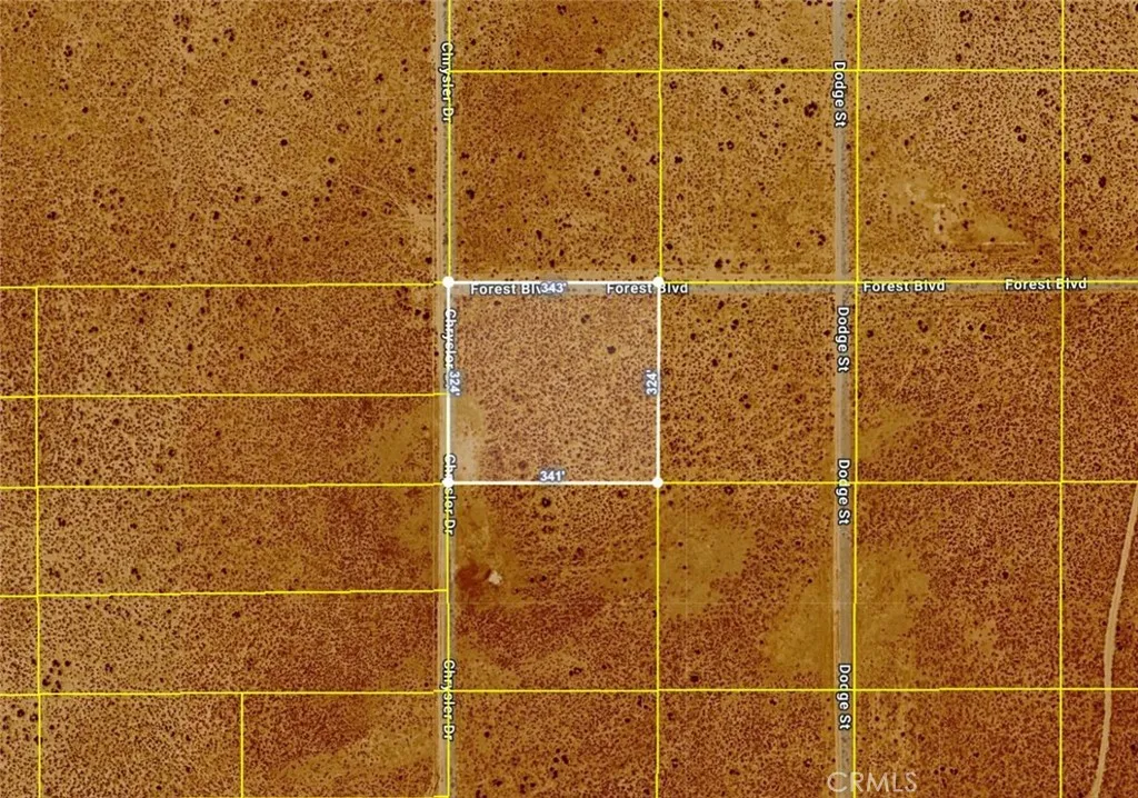 Great 2.5-acre land parcel southeast of California City for a great price! This property is very close to paved Claymine Rd and the small town of Aeriel Acres. It sits at the corner of Chysler Dr and Forest Blvd. It is not a “landlocked” property, which is rare at this price point! It’s easy to reach and ready to use. This area is very popular for off-roading and camping. This may be a great location to camp, go off-roading, install a mobile home, build a house, or start a small farm. The location is in the path of growth and this may be a very good long term investment due to its street frontage and close proximity to the freeway. Don’t miss out!