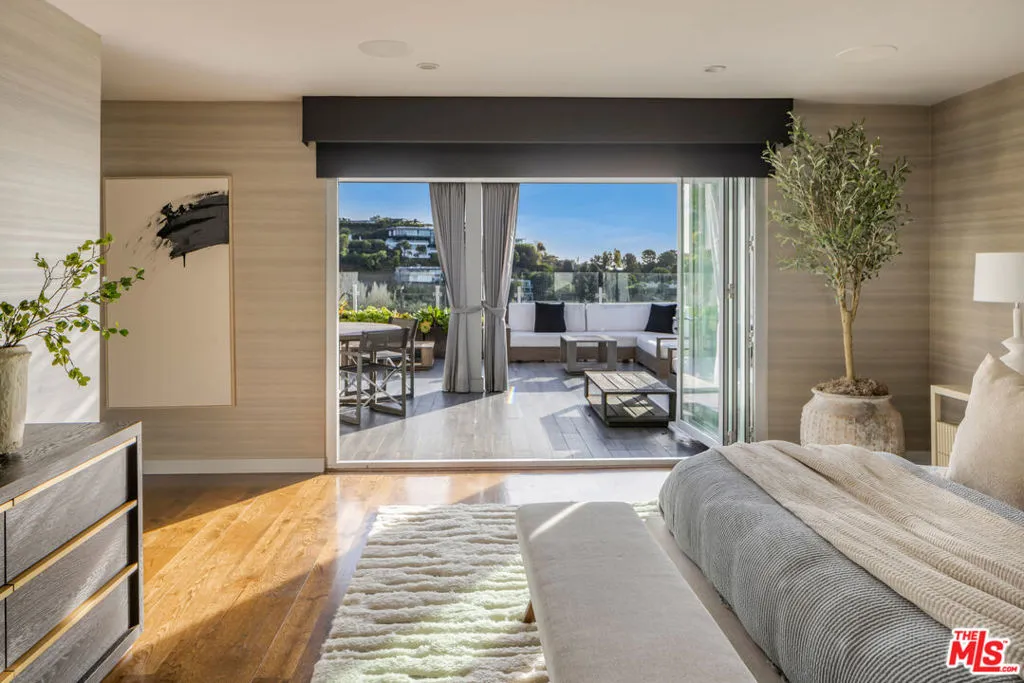 Set above the Sunset Strip in the legendary Bird Streets, this modern hillside retreat commands jetliner panoramas stretching from Downtown Los Angeles to the Pacific, offering a rare sense of calm and seclusion just moments from the city. Positioned across multiple levels and thoughtfully designed for privacy, the residence unfolds through expansive walls of floor-to-ceiling glass that bathe the interiors in natural light while framing uninterrupted views at every turn. Custom wall treatments and bespoke upgrades create intentional spaces designed for both everyday living and entertaining.The kitchen is both a functional centerpiece and a gathering place, appointed with custom millwork, professional-grade appliances, and a substantial center island that anchors the main level. Adjacent living spaces extend naturally to outdoor terraces, while an upper-level family room opens directly to additional patios, allowing the home to unfold outdoors.The primary suite is positioned as a private escape, with direct access to an expansive terrace arranged for open-air dining and quiet relaxation against a sweeping city backdrop. Within, a generous walk-in closet with safe and a finely finished bath – featuring dual vanities, a soaking tub, and marble shower – complete the suite. Guest accommodations throughout the residence maintain the same level of consideration, offering privacy and comfort in equal measure. Above it all, a rooftop retreat, bordered by mature hedging, introduces a rare vantage point with an additional putting green and jacuzzi, suspended high above the lights below.