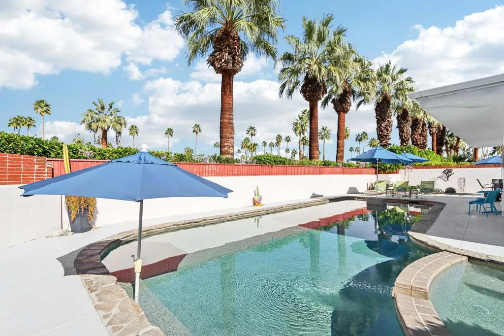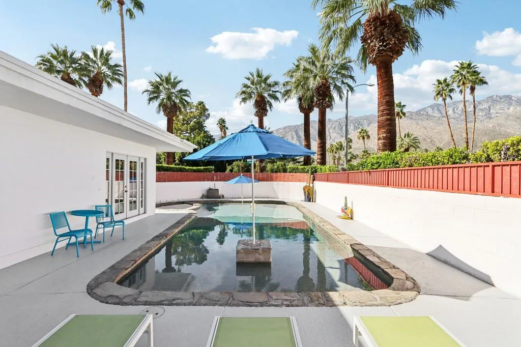 CALLING ALL MID-MOD ENTHUSIASTS! Welcome to this iconic South Palm Springs gem, perfectly positioned on a corner lot in the coveted ”Canyon Palms” neighborhood. Situated on fee simple (owned) land with NO HOA, this authentic 1966 Mid-Century Modern residence delivers timeless architecture, thoughtful updates, and unforgettable mountain views. From the moment you arrive, the elegant circular driveway sets the tone. Meander through the signature citrus-yellow ”ring-a-ding-ding” dual front doors into a striking foyer accented by rich walnut-toned wood batten walls. The living room captivates with its dramatic angled granite wall surrounding a natural gas fireplace, all framed by floor-to-ceiling windows and sliding glass doors that flood the space with natural light. The updated kitchen is a chef’s delight, featuring solid walnut cabinetry, imported Krion counters, and a full suite of charcoal-toned KitchenAid appliances. Adjacent, a sun-drenched dining area boasts soaring ceilings and clerestory windows, while a tucked-away wet bar with sink and beverage cooler makes entertaining effortless–cocktails, anyone? The primary suite offers a private retreat, with double doors opening directly to the lush backyard oasis, from the bathroom as well. Guest bedroom #2 also enjoys double-door access to the pool and spa, seamlessly blending indoor and outdoor living. A third bedroom currently serves as an office or studio, offering flexibility to suit your lifestyle. Outside, the magic continues. Drift through the living room doors onto a lush lawn with dual dining patios, BBQ grill, and pizza oven anchored by the original raised fire feature. Wander around to the hidden garden lounge along the south side of the home which provides a peaceful escape, while the north end of the yard reveals a stunning PebbleTec, saline pool and relaxing spa (new heater and filter in 2025). There is a roomy storage shed too. The panoramic views of Mt. San Jacinto are simply breathtaking. This is Palm Springs desert living at its finest–stylish, serene, and unmistakably Mid-Century. Don’t wait–come experience it for yourself!