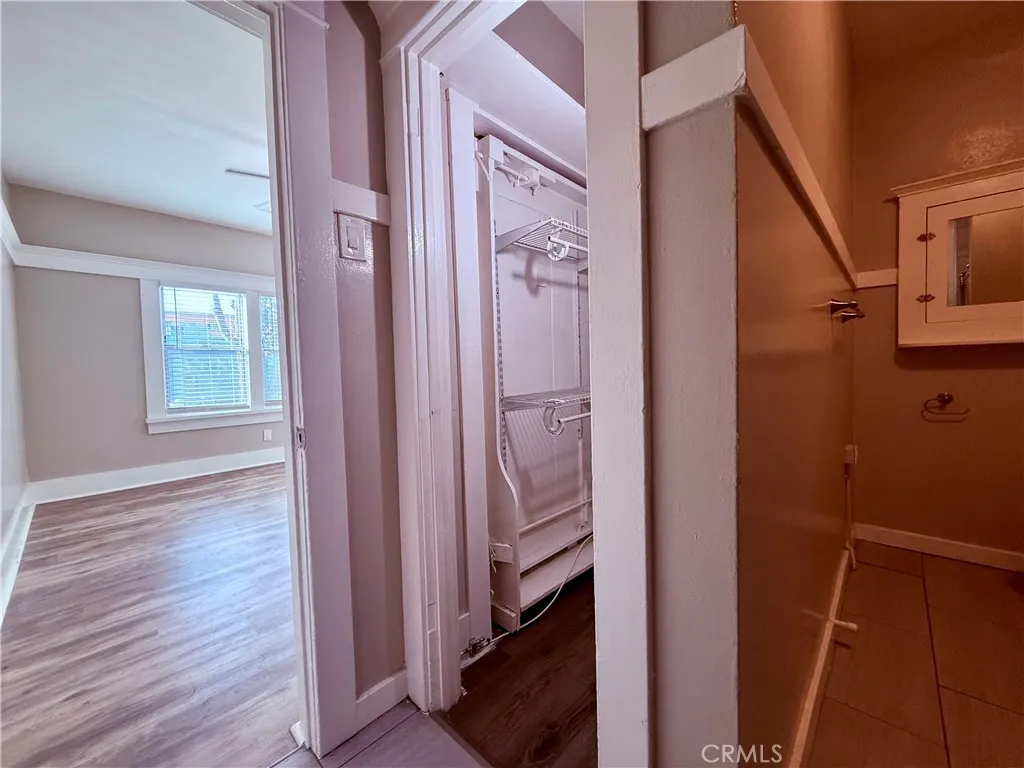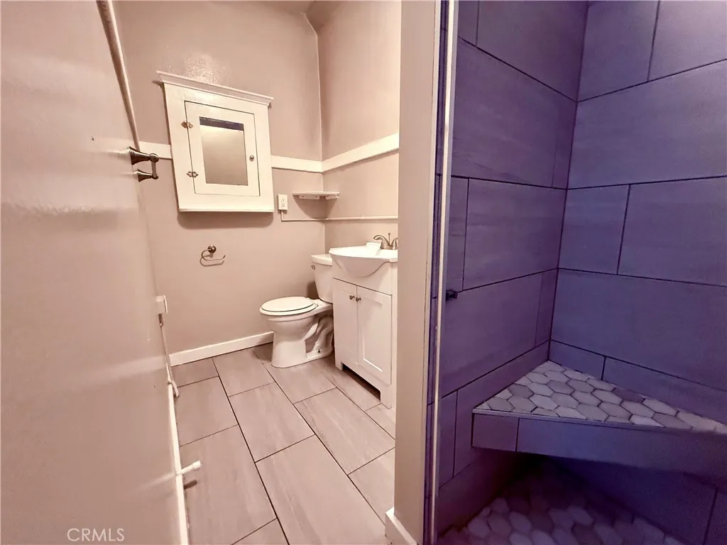 Open layout with a wide arched opening between living and bedroom areas. Includes a walk-in closet and an updated bathroom with a walk-in tiled shower.