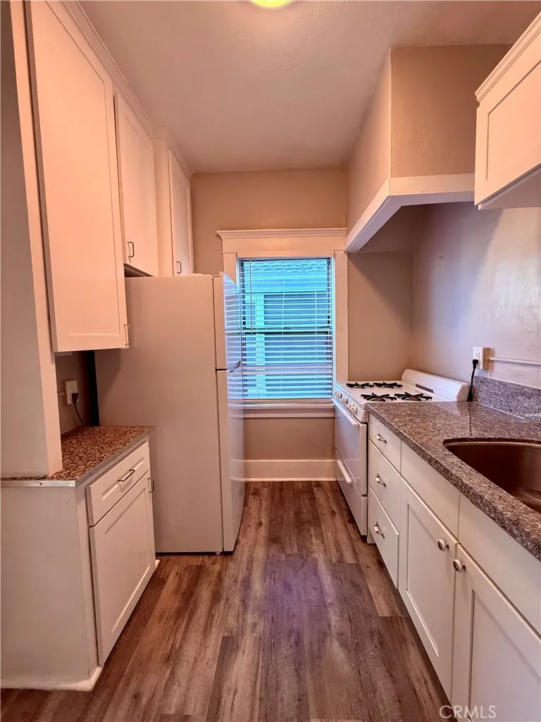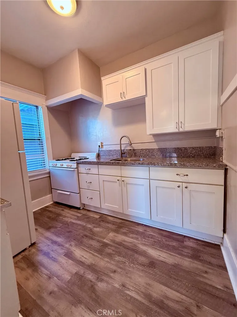 Kitchen with granite countertops, ample cabinetry, and refrigerator and gas range included.