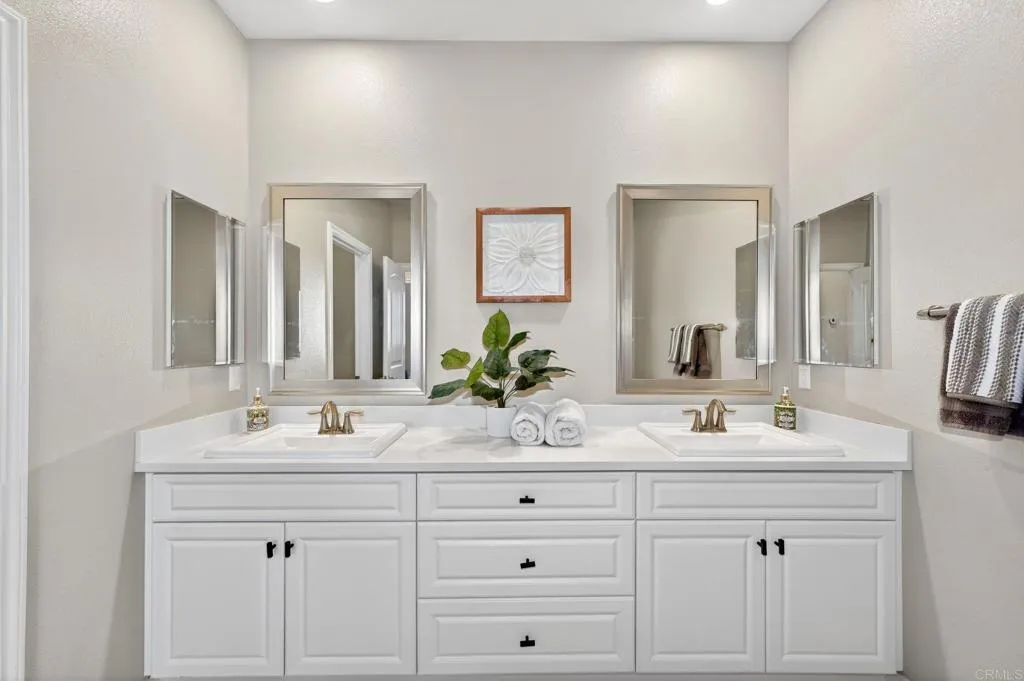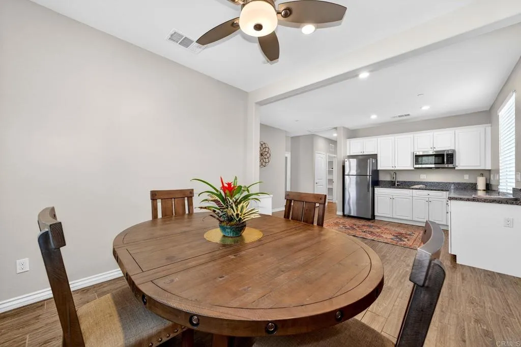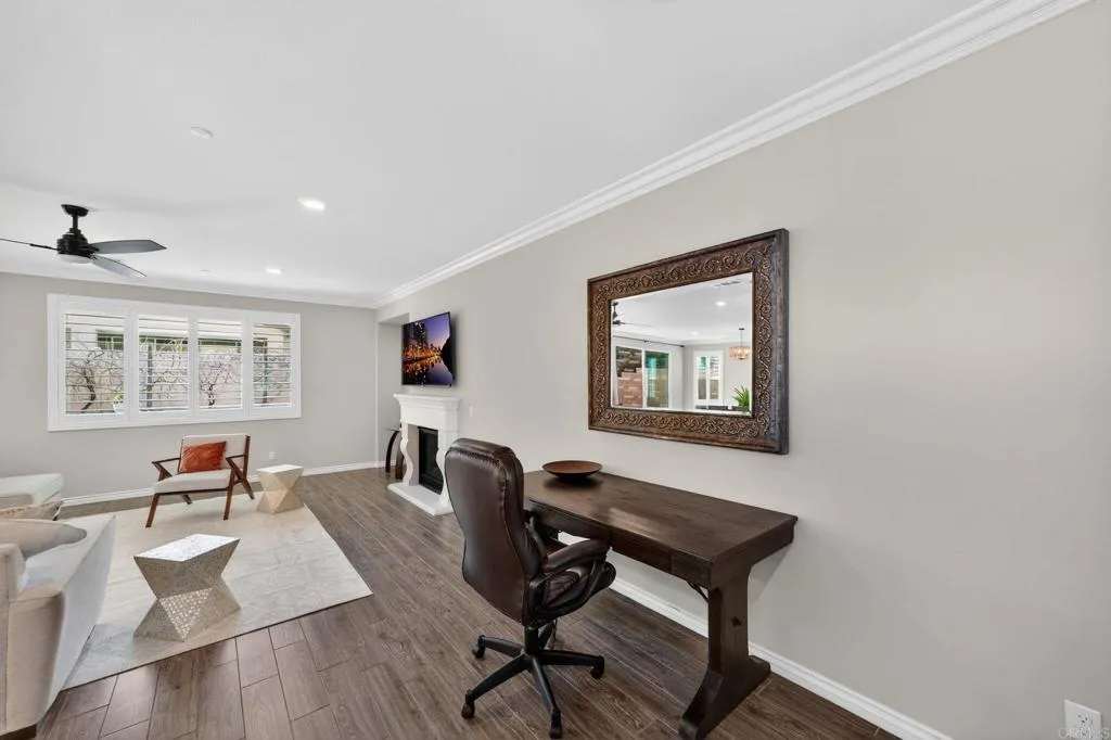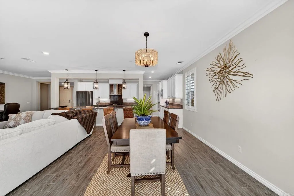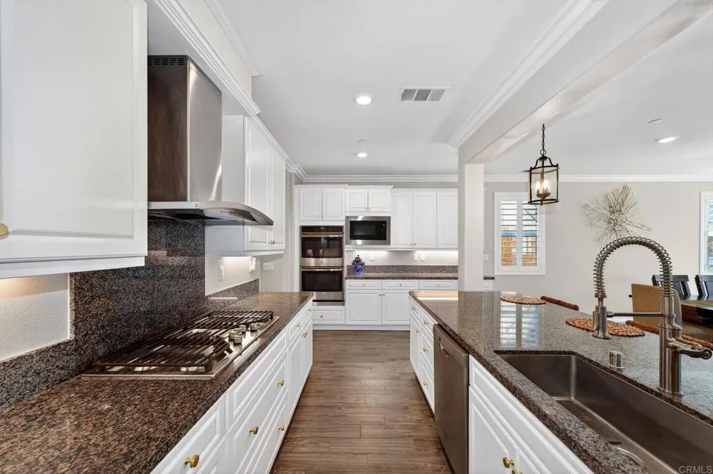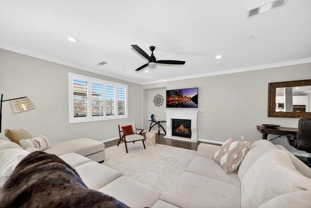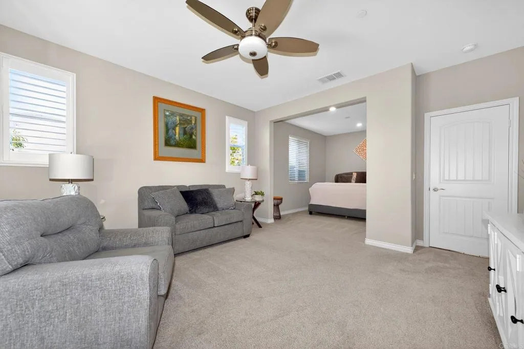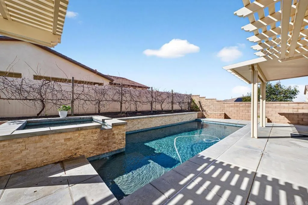 Elegant and thoughtfully designed, this corner-lot residence is nestled on a quiet cul-de-sac and offers refined living with exceptional versatility. The open-concept floor plan showcases a living room with fireplace flowing into a chef’s kitchen with an oversized island, walk-in pantry, and premium finishes, complemented by tile flooring and energy-efficient windows with plantation shutters. The expansive primary suite features a spa-inspired bath with dual vanities, soaking tub, and separate shower, while a loft and an upstairs mini-suite with attached bath provide flexible living spaces. Additional highlights include dual-zone air conditioning, tankless water heaters, a whole-house fan, ceiling fans throughout, mesh wired internet/Wi-Fi, and fully owned solar for both electricity and pool heating. The resort-style backyard is designed for elevated entertaining with a covered patio, built-in barbecue, and a saltwater Pebble Tec pool and spa featuring a beach entry and smart Pentair automation. A discreetly attached guest house with private entrance offers exceptional multigenerational or guest accommodations, complete with a kitchen, living and dining area, walk-in pantry, laundry, and a private bedroom with a retreat. A three-car garage with electric vehicle charging capability, new front-yard turf, covered front porch, and mature lemon and grape-producing vines complete the property. Ideally located in the Terracina Community of South Temecula, residents enjoy award-winning schools, renowned wineries, championship golf courses, vibrant Old Town dining and entertainment, scenic outdoor recreation, and convenient access to major commuter routes—delivering an exceptional Southern California lifestyle.