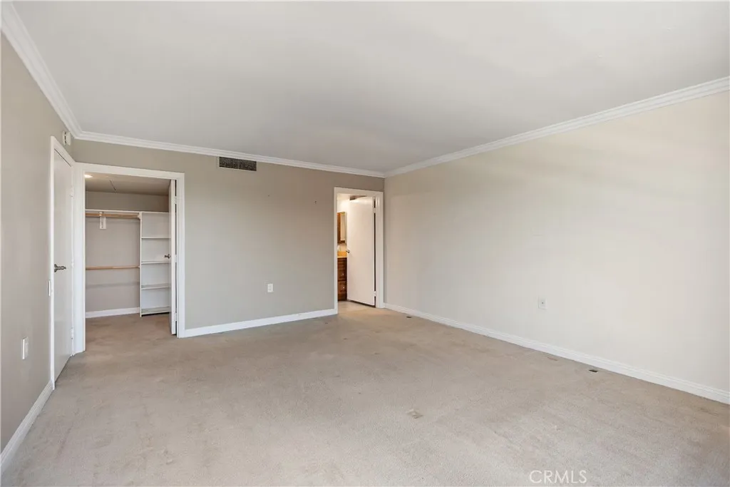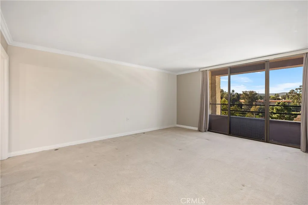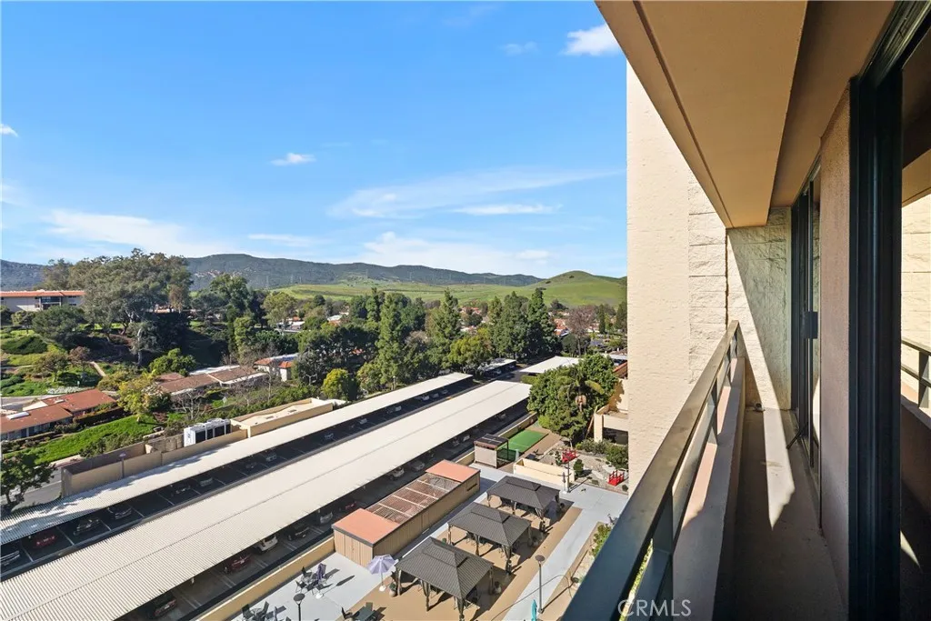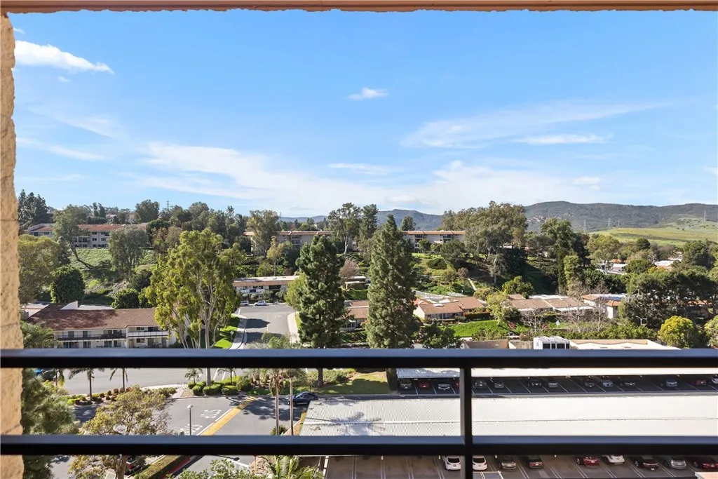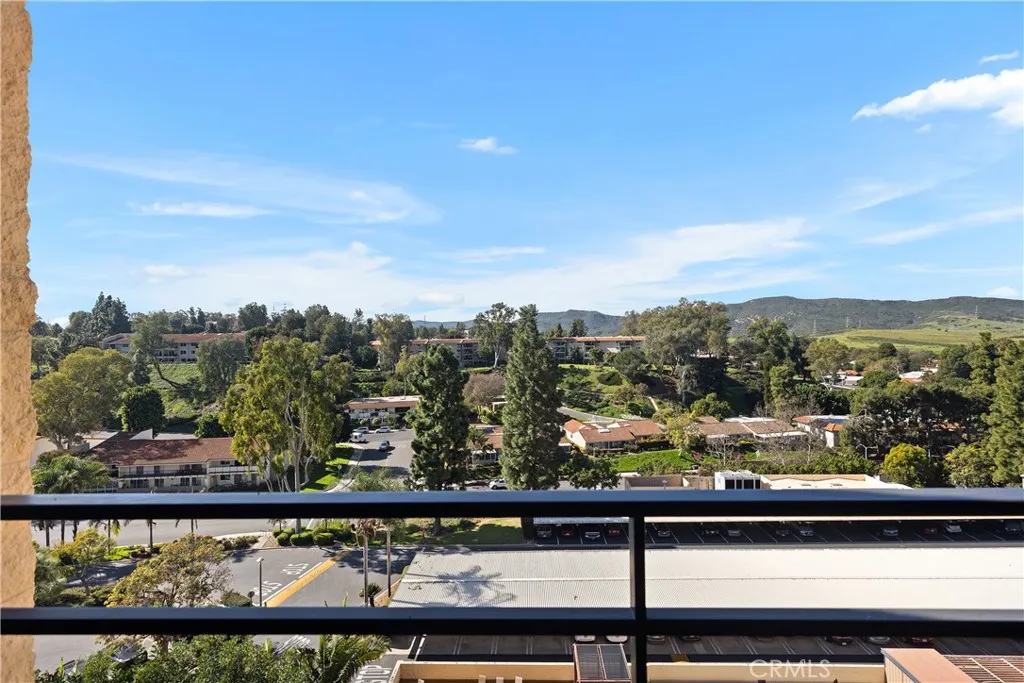 Immaculate and move-in-ready End unit condo in the Laguna Woods Towers with panoramic hill and neighborhood views. Updated home is light and bright. This 2-bedroom, 2-bathroom unit offers a spacious living and dining area with floor to ceiling sliding doors that open to a long, covered Juliet style balcony, perfect for enjoying fresh air and the scenery. The open kitchen features abundant wood cabinetry, granite counters, a breakfast bar peninsula, built in wine rack, and recessed lighting. The primary suite enjoys the views and includes a walk-in closet with built-in shelving and a private bathroom with updated granite vanity. The second bedroom also has slider access that opens to the balcony and includes a full wall built-in desk and cabinetry, ideal for a home office, hobby room, or guest space. There is a guest bathroom with step in shower and grab bars. Crown molding, smooth ceilings, Engineered wood flooring in the main living areas, and abundant storage complete the home. The Towers monthly assessment includes a $500 monthly dining credit for meals in the Crystal Dining Room or Cafe Latitude 50, housekeeping visits every two weeks, utilities, cable TV, free laundry facilities, 24-hour desk services, 24-hour onsite maintenance, and many activities, along with shared outdoor patios. Shuttle bus service arrives at the front door and can take you throughout the community and local shopping. As a Laguna Woods Village resident you will also be able to enjoy activities at 7 clubhouses, 5 swimming pools, private community golf courses (27 hole championship course and 9-hole par executive courses), tennis courts, lawn bowling greens, shuffleboard courts, craft and hobby workshops, garden centers, game rooms, billiard rooms, gym, horse stables, a very active theater and arts community, and library. Over 200 social clubs to join. This is all within a beautifully landscaped, gate guarded golf community convenient to freeways, shopping, restaurants, outstanding medical facilities and of course, the beach.