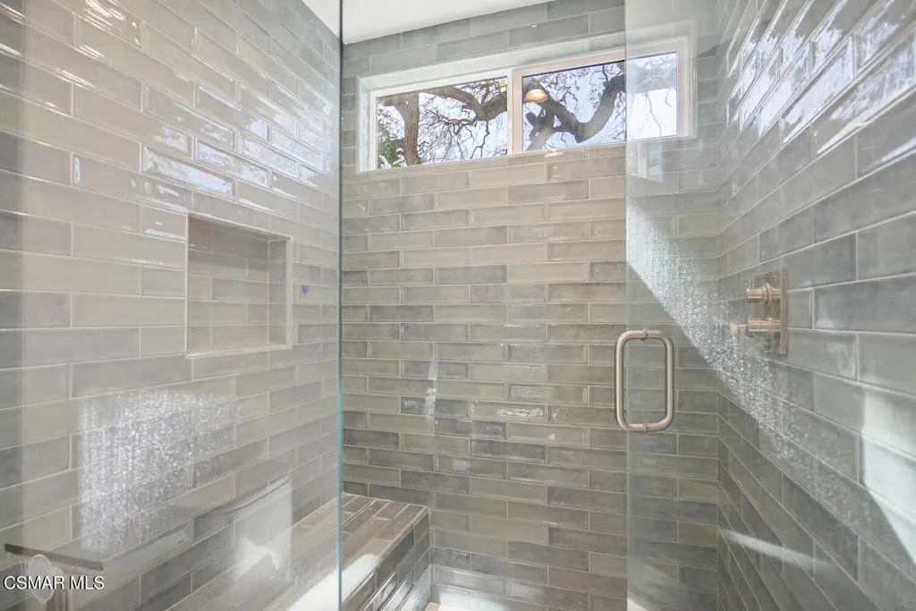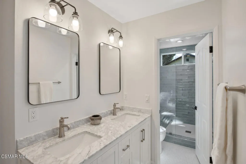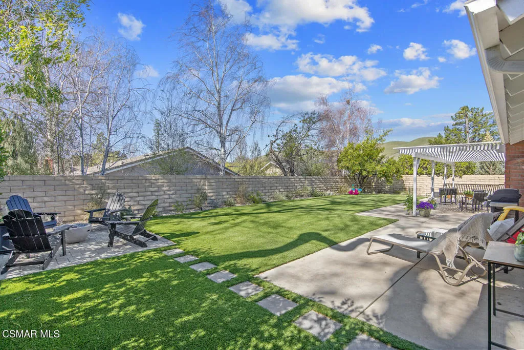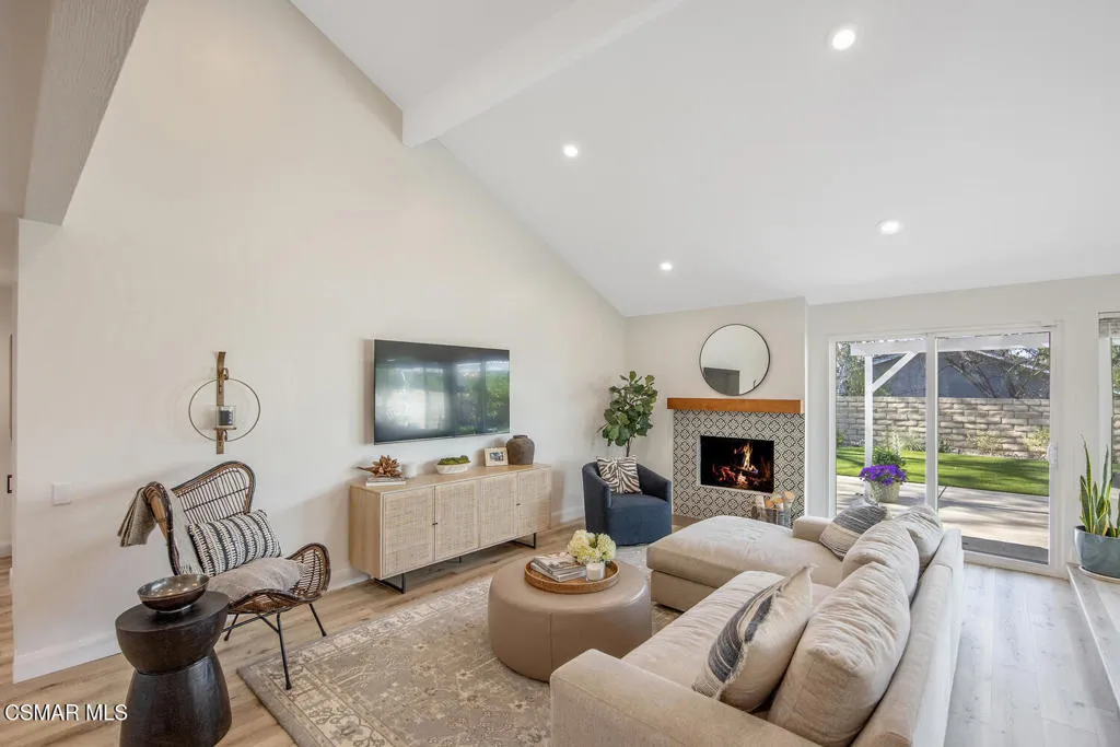 Welcome to this fully updated single-story home located in the highly desirable Westlake Hills neighborhood. With tons of natural light, the open-concept layout features soaring high ceilings, an expanded kitchen, recessed lighting, a gorgeous fireplace with custom tile work, and newer wide plank designer flooring. This bright and welcoming atmosphere is ideal for both everyday living and entertaining. Step outside to the extraordinarily spacious and peaceful backyard with lovely mountain and tree views, new easy-care turfed landscaping and drip irrigation, mature fruit trees, large patio, a cozy newly paved fire pit deck and a dedicated dog run. This backyard has amazing sunset views and provides privacy and serenity perfect for relaxing evenings or gatherings with friends and family. Both bathrooms have been tastefully updated, including a primary suite with an enlarged shower with bench seating and dual sinks. The second bedroom is enhanced with custom organization by California Closets, maximizing functionality and storage. Additional upgrades include a new HVAC system with updated ducting, new electrical panel, newer tankless water heater, newer double pane windows, a garage with epoxy floors, an EV charger, and a large overhead storage space with a pull-down ladder. TVs in the home are hardwired in the walls for optimal streaming performance. Situated in a convenient and coveted neighborhood in the heart of Westlake Village, with a low voluntary HOA, residents enjoy access to beautiful walking greenbelts for easy access to a top-rated elementary school, parks, restaurants, shopping, and nearby hiking trails. This turnkey home combines comfort, style, and an unbeatable location.