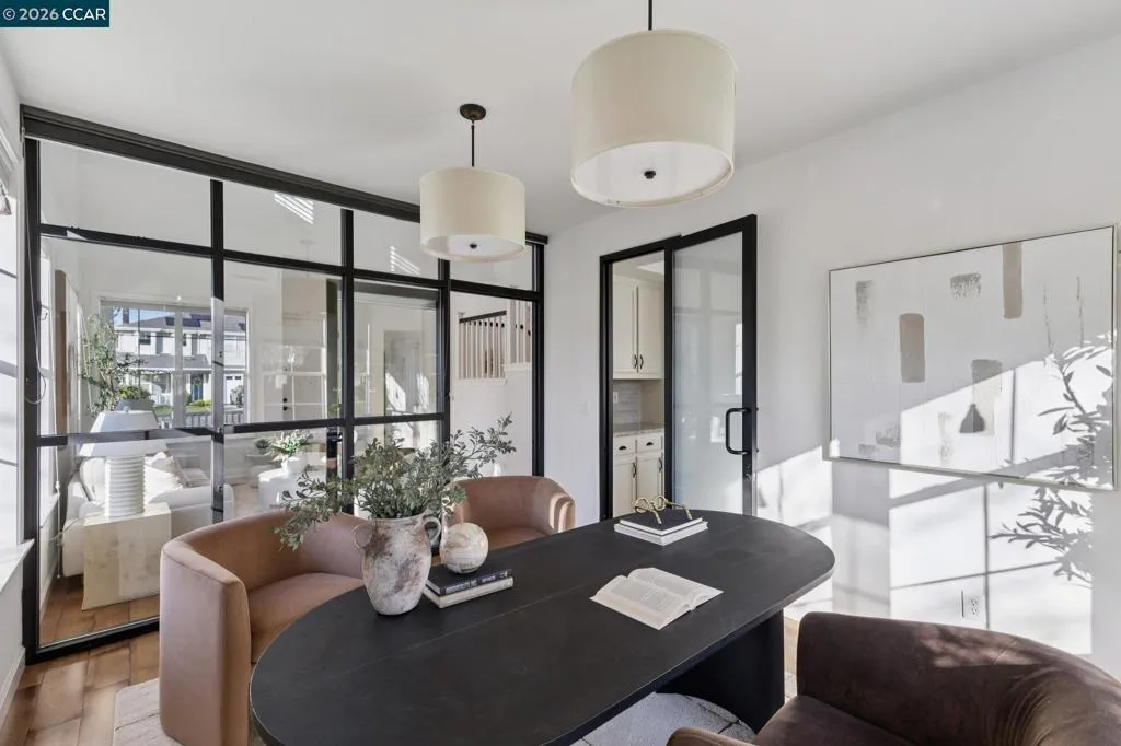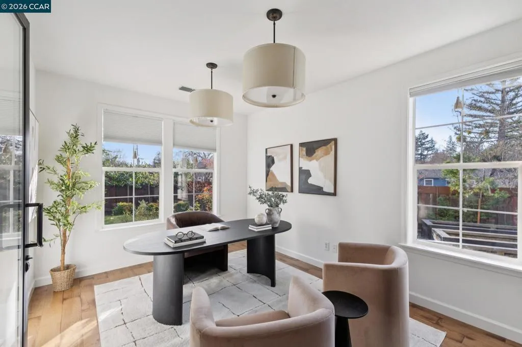 Situated on a quaint cul-de-sac and adjacent to a trail, this beautifully updated and modern home offers a central Walnut Creek location with everyday ease. A spacious front porch welcomes you into an open, airy layout where natural light and beautiful floors set the tone throughout. A private office sits just off the living room, ideal for focused work or creative pursuits. The updated eat-in kitchen flows seamlessly into the family room and out to the covered patio, creating effortless indoor-outdoor living and entertaining. The backyard features a covered patio with a wood plank ceiling, a built-in sitting area with a firepit, BBQ gas hookup, and motorized awnings that provide additional shade over the lawn. Upstairs, the primary suite is joined by two additional bedrooms with a Jack-and-Jill bathroom, along with a versatile loft that functions beautifully as a study area or hobby nook. Over $200K in thoughtful upgrades enhance comfort and functionality, including split-level heating and cooling, window blinds and shutters, high-end ceiling fans, EV charging, a Rachio smart irrigation system, a new roof, and owned solar. Set on a quiet court with convenient freeway and BART access, and just minutes to Larkey Park and trails, this home offers style, comfort, and location.