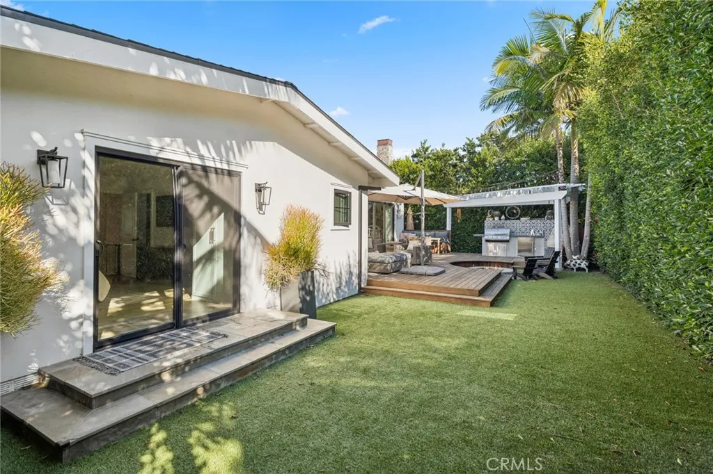 Designed for both comfort and entertaining, the home features a gated front grass courtyard and an ultra-private backyard lined with mature ficus trees. The backyard offers a fire pit, built-in BBQ, dining area, and outdoor TV space—ideal for hosting and enjoying Southern California living year-round.