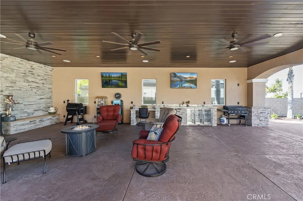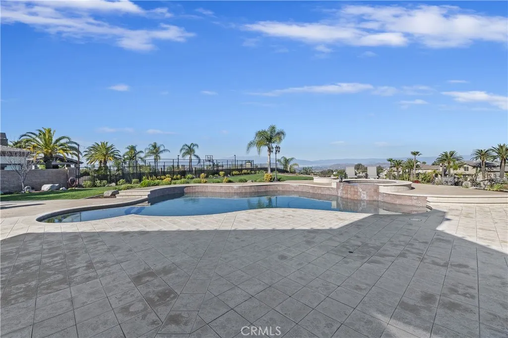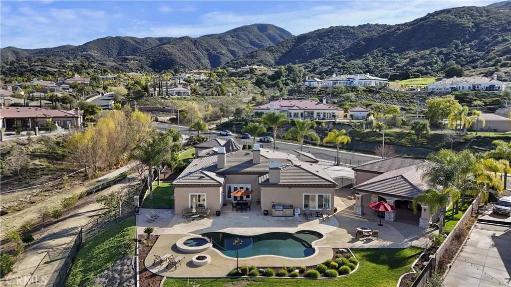 Step outside to a private backyard retreat featuring sweeping views and an expansive 1,250-square-foot outdoor living area. Designed for year-round enjoyment, this space includes surround sound, a built-in BBQ, dual fire pits, an outdoor refrigerator, and an ice machine. The resort-style pool and spa are easily managed with the AquaLink system, offering a relaxing escape at home.