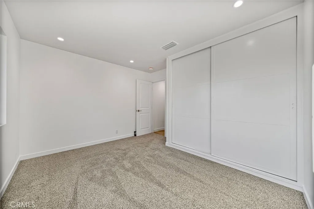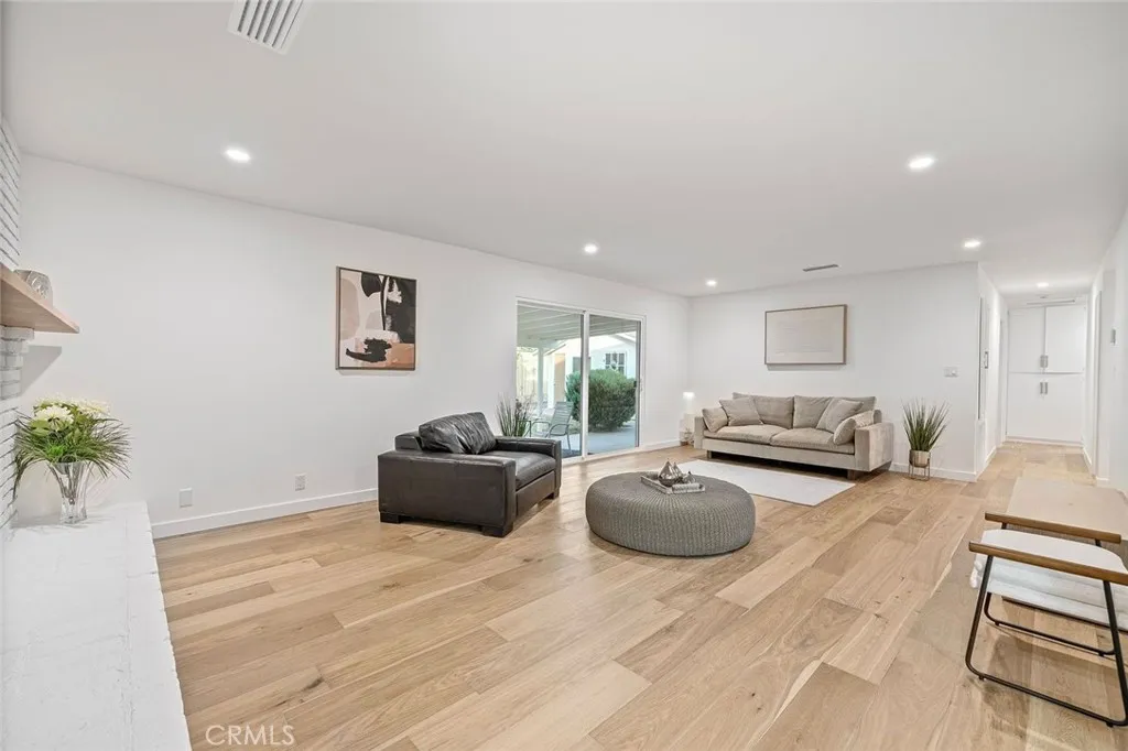 The home features a beautifully updated kitchen with new cabinetry and quartz countertops, newly remodeled bathrooms, wood flooring throughout the living areas, and recessed lighting across the entire home.