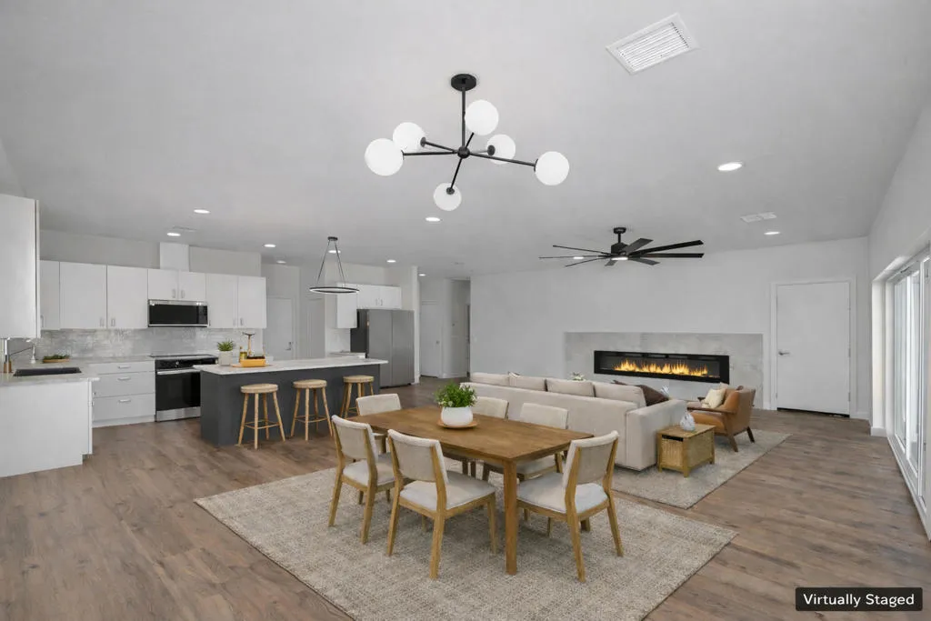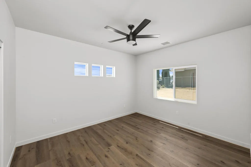 Welcome to 7082 Avalon Avenue – a newly completed modern desert home in the heart of Yucca Valley, offering 3 bedrooms, 2 bathrooms, 1,560 sq. ft., on nearly half an acre with paid solar. Built with a true quality-over-quantity mindset, this home features 2×6 framing for enhanced insulation, helping keep interiors cooler in summer and warmer in winter. With an east-west orientation, the home is positioned to capture stunning sunsets that can be enjoyed from the main living areas, including the living room, dining area, and kitchen, bringing the desert sky and natural light into everyday living. A striking White Coconut exterior with bold black accents and vibrant green entry details makes an immediate statement. Enjoy a spacious 2-car garage plus wide side yards with plenty of room for your RV, trailers, and more. Inside, an airy open-concept layout is filled with natural light from 6-foot-tall living room windows and a dramatic 12-foot sliding glass door opening to the backyard, creating seamless indoor-outdoor flow for effortless desert living and entertaining. The kitchen shines with quartz countertops, a crisp white tile backsplash, a large island with bar seating, and a full suite of brand-new Samsung stainless steel appliances. A walk-in pantry and a dedicated laundry room, complete with an included washer and dryer, folding counter, and built-in cabinetry, add everyday ease. Privately located at the rear, the primary suite offers backyard access, a walk-in closet, and an ensuite bath with dual vanities and a glass-enclosed shower. Two additional bedrooms and a full guest bath sit near the front for ideal separation and flexibility. The blank-slate backyard is ready for your dream oasis – enjoy wide-open skies and vibrant sunsets from the covered patio. Seller to install a full-perimeter privacy fence after close of escrow with an accepted offer at full list price or higher (terms and design per seller). Ideally located near everyday conveniences, local dining, and outdoor recreation, with easy access to Joshua Tree National Park and a short drive to Palm Springs. See the sunsets for yourself – Schedule a tour today!