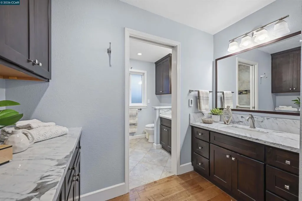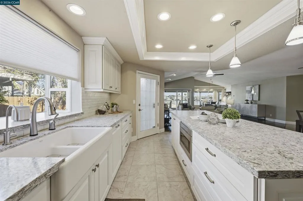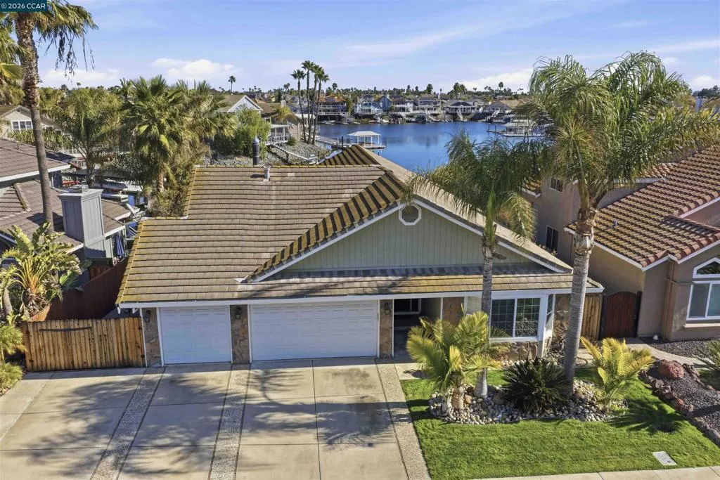 Beautifully remodeled single story waterfront home with stunning water views, sought after eastern exposure, a 3 car garage and side yard access. Spacious open floor plan features massive great room with vaulted ceilings. Remodeled chef’s kitchen features stone counters, high end appliances, and a large island with bar seating. Spacious primary suite features vaulted ceilings, gorgeous water views and sliding glass door to covered deck. Spa-like primary bathroom features a large walk-in shower. Huge laundry room. Gorgeous covered Ipe deck with ceiling fans. Oversized U-shaped vinyl dock has room for all your water toys!. Tons of storage space. Perfect for indoor/outdoor living and entertaining. Access to over a thousand miles of delta waterways from your backyard!