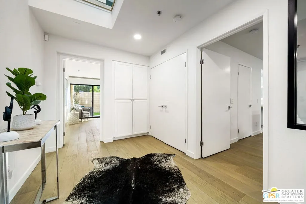 Enjoy modern desert living in this remodeled 2-bedroom, 2.5-bathroom condo townhouse where you can experience sophisticated living with mountain views in a prime location. Spanning two stories, this residence features brutalist architecture, glass railings with large glass windows and doors creating a seamless flow between indoor and outdoor living. The open-concept kitchen, dining, and living areas are bathed in natural light. Located just moments from downtown Palm Springs, the Uptown Design District, and world-class dining, this exclusive, secure, and secluded clothing-optional community offers a private retreat for those seeking a desert residence. This is a naturalist community, you have 1 assigned carport space and additional spaces for a fee upon request. Compared to newer developments such as Canyon View, Elan or Cody Place, E Stevens offers a more convenient location, prominent mountain views, brutalist architecture and the best price per square foot.